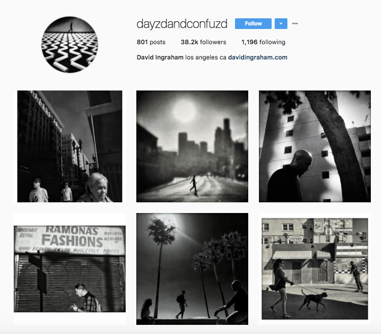 David Ingraham's first camera was a Kodak Pocket Instamatic. A professional musician by trade, he spends his free time with his current camera of choice: an iPhone. His black-and-white photographs of people walking through various LA neighborhoods make it feel like you're stepping back in time, but don't be fooled: his most recent 'gram was taken this month.