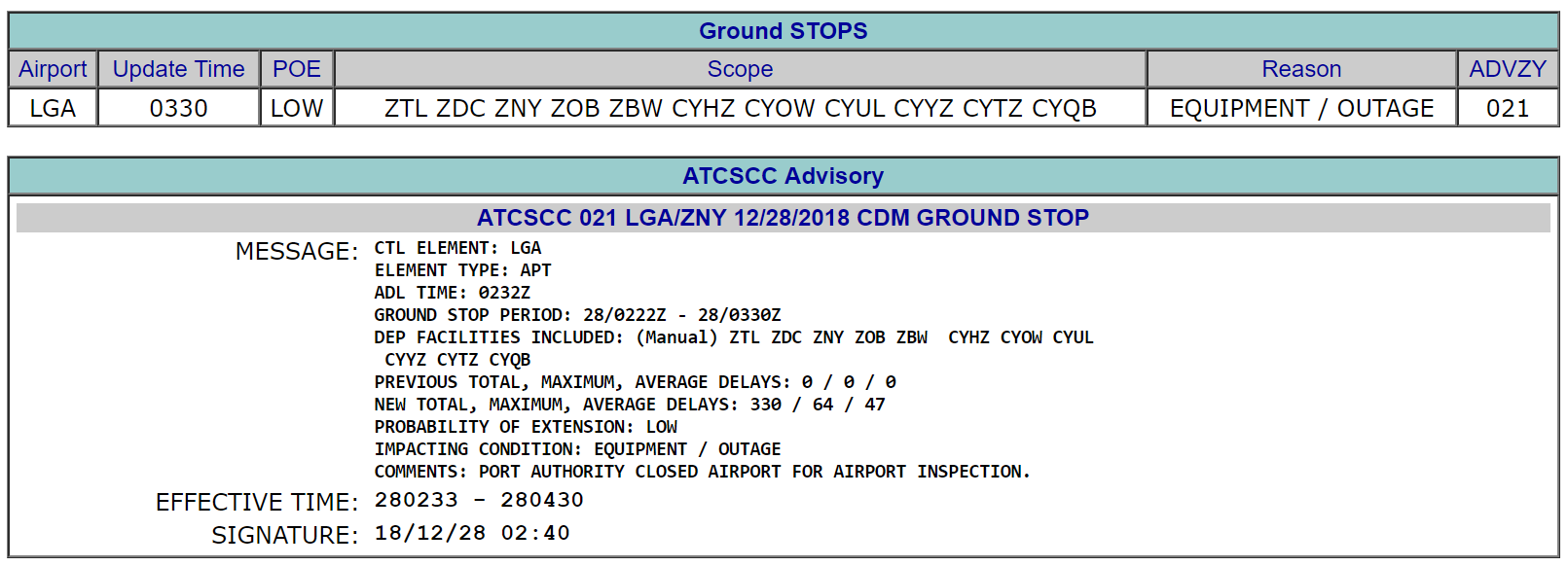 At 9:40pm, the Federal Aviation Administration issued a ground stop for LaGuardia, closing the airport until at least 10:30pm. The reason for the ground stop is listed as "Port Authority closed airport for airport inspection."