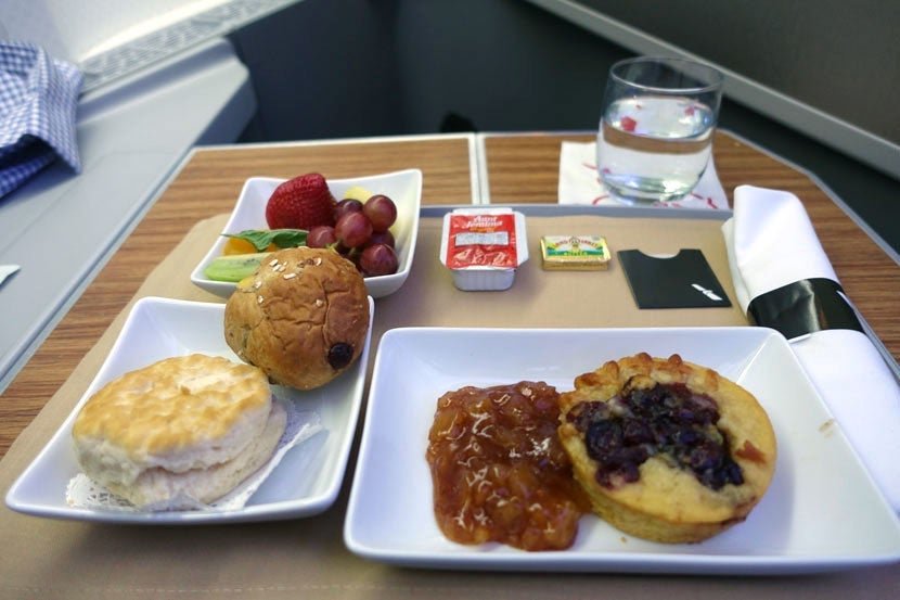 As we departed, the in-flight service began, and to my surprise, we were given a hot meal with a choice of eggs or waffles. The waffles were served with fresh fruit and a selection of breads, which were all sub-par breakfast items, but considering it was a short flight, it got the job done.