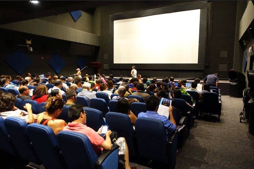 A nearly completely full theater full of people learning about the history of the Panama Canal.