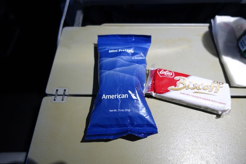 American Airlines offers two complimentary snacks: pretzels and Biscoff cookies.