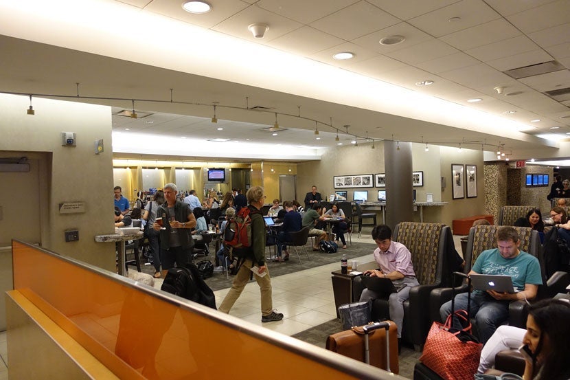 The crowded Admirals Club near gate 42 still offered complementary snacks as well as a variety of drinks.