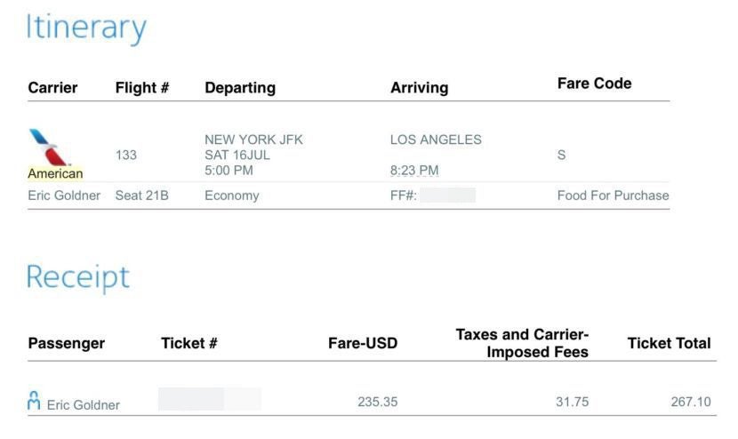 You generally can't add the initial flight from New York to Los Angeles in the same reservation, so I booked this leg separately for $267.10 in economy on AA.
