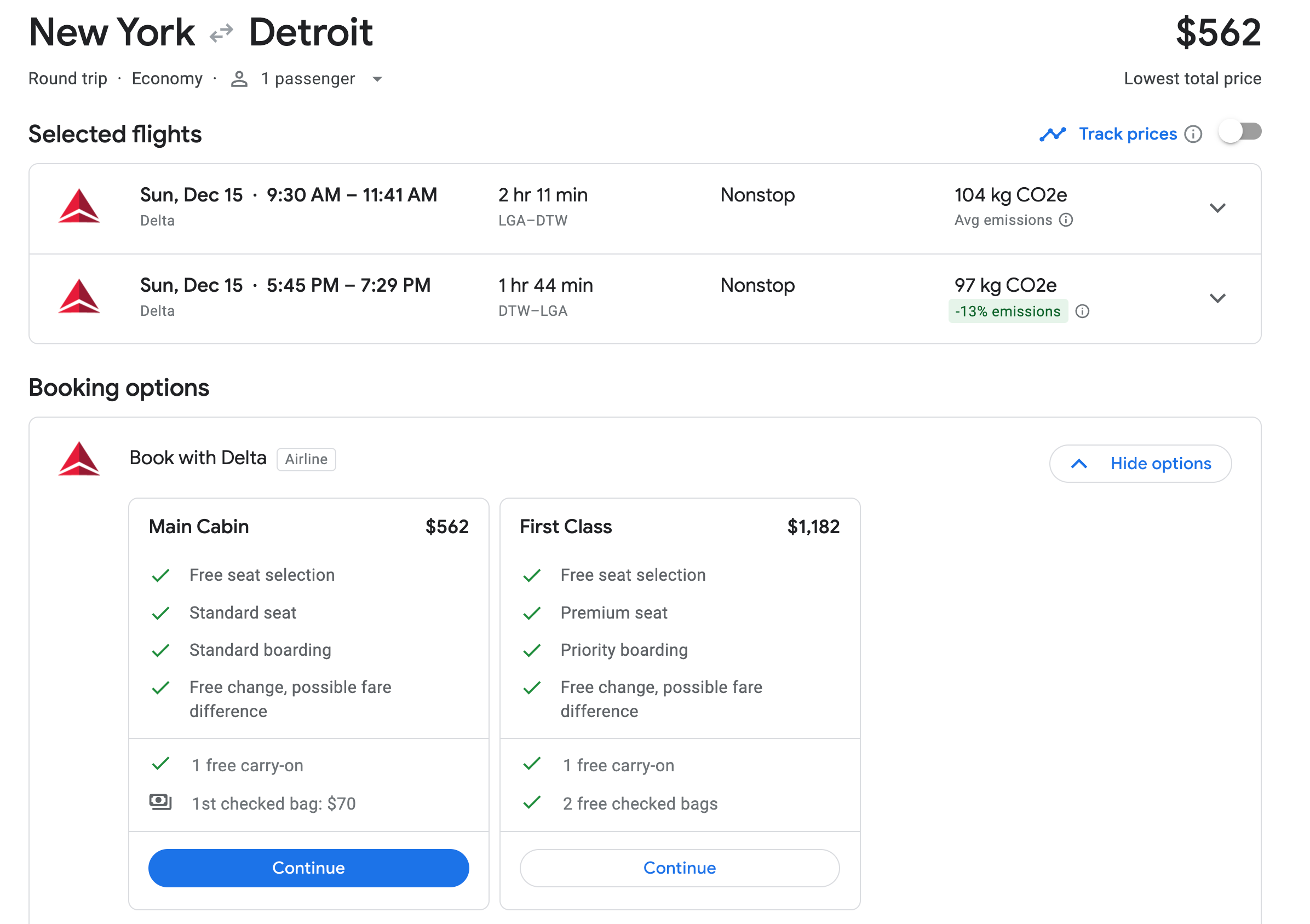 A same-day return from John F. Kennedy International Airport (JFK) to Detroit Metropolitan Wayne County Airport (DTW) on Dec. 15, 2024, costs $562 in Main Cabin and would earn 562 MQD toward your 2025 Medallion status.