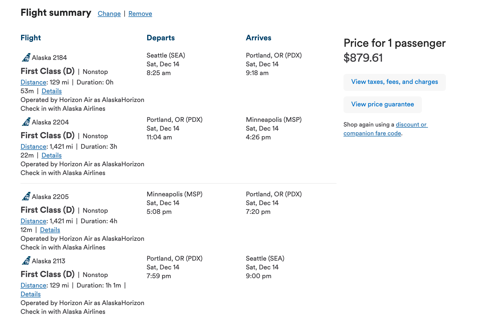 This itinerary is from Seattle-Tacoma International Airport (SEA) to Minneapolis-St. Paul International Airport (MSP) via Portland International Airport (PDX) on Saturday, Dec. 14. You would fly 3,100 miles in D class (first class), which earns 150% EQMs. It would earn an impressive 4,650 EQMs for $879.61 and could be completed in a day.