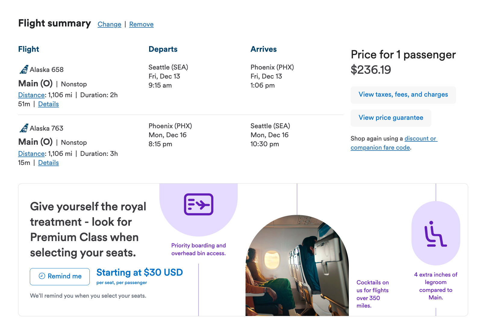 If you'd like to make a weekend of it and perhaps are looking for fewer EQMs and less travel time, nonstop flights from Seattle to sunny Phoenix Sky Harbor International Airport (PHX) can be had for $236 in O class, which earns 100% EQMs.