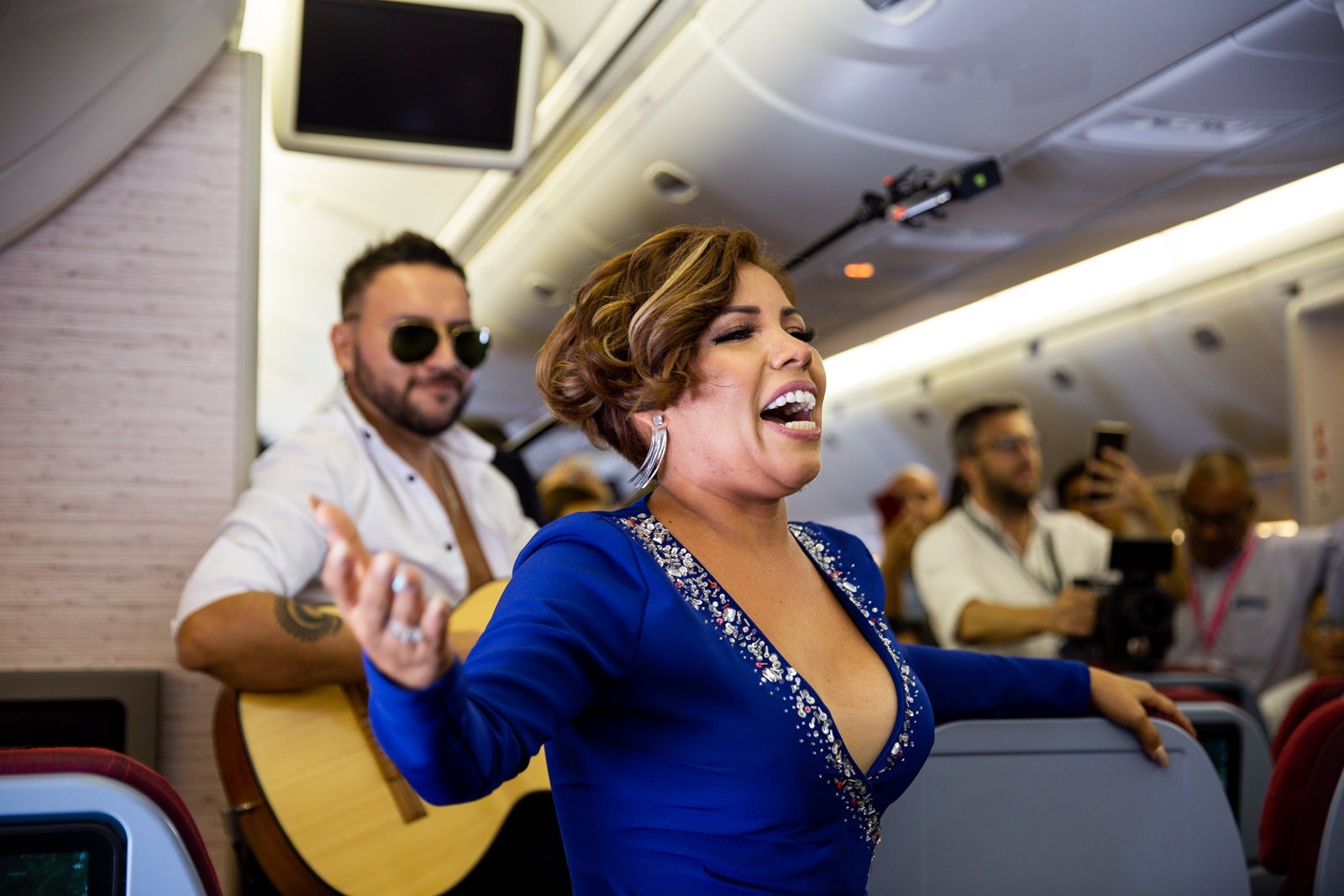 For the official debut of its new interiors, LATAM trotted out a famous Peruvian singer, Susan Ochoa, who appeared midflight, walking down the aisle towards the middle of the cabin.