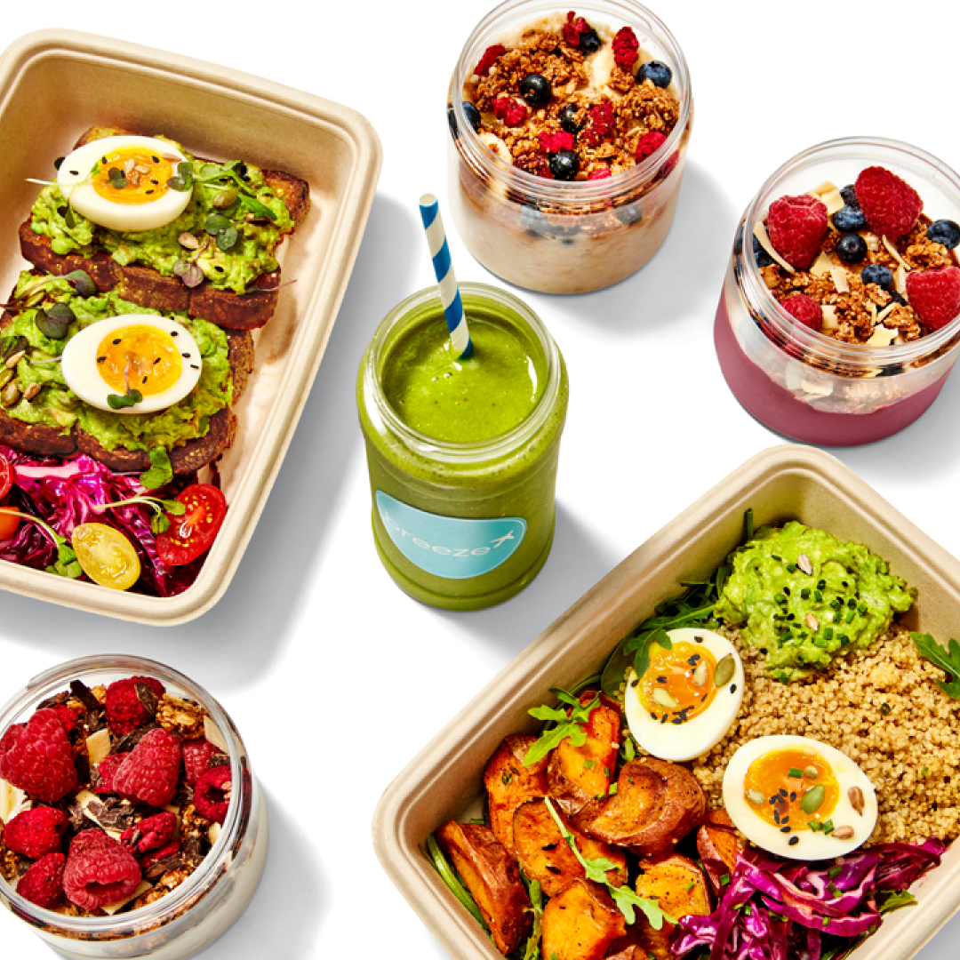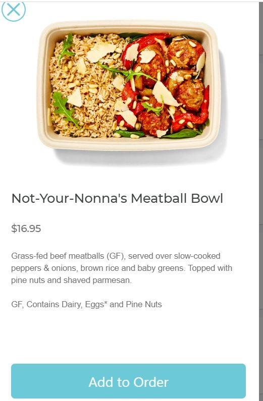 Breakfast options range from $8-$14 and include dishes such as overnight oats, green smoothies, açai jars, gluten free avocado toast and breakfast bowls. Lunch and dinner options range from $14-$17 and include a salmon bowl, chicken harvest bowl, chicken zucchini noodle salad, grass-fed meatball bowl and a vegan Buddha bowl. Gluten-free, vegetarian and vegan items are available.