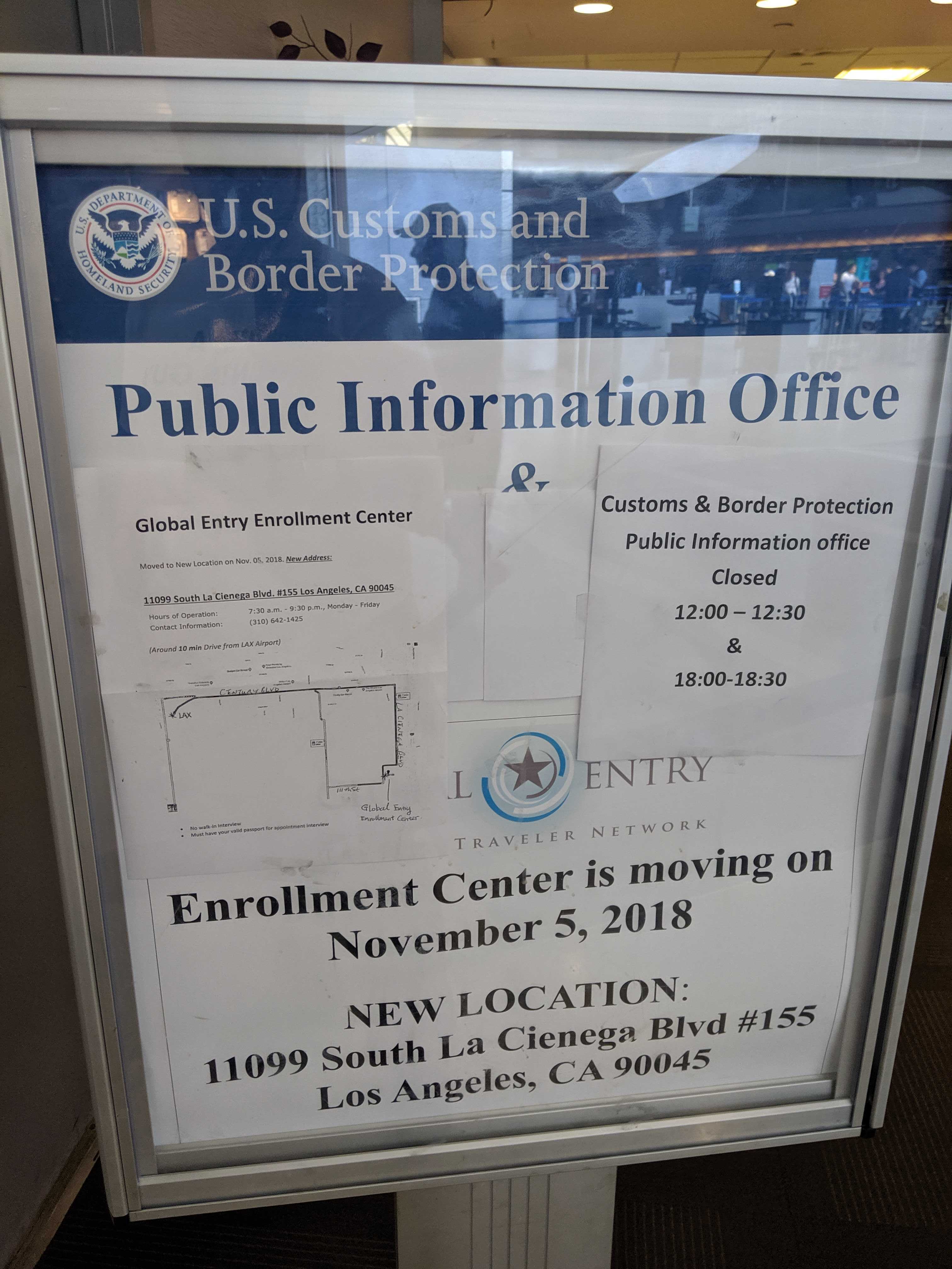 A Global Entry applicant from the L.A. area who had received conditional approval scheduled an interview on July 1st at the LAX enrollment center. The interview was scheduled for July 19. She told The Los Angeles Times that she did not receive any notifications regarding the closure of the enrollment center and arrived for her scheduled interview on July 19. When she arrived at the enrollment center, the doors were locked.