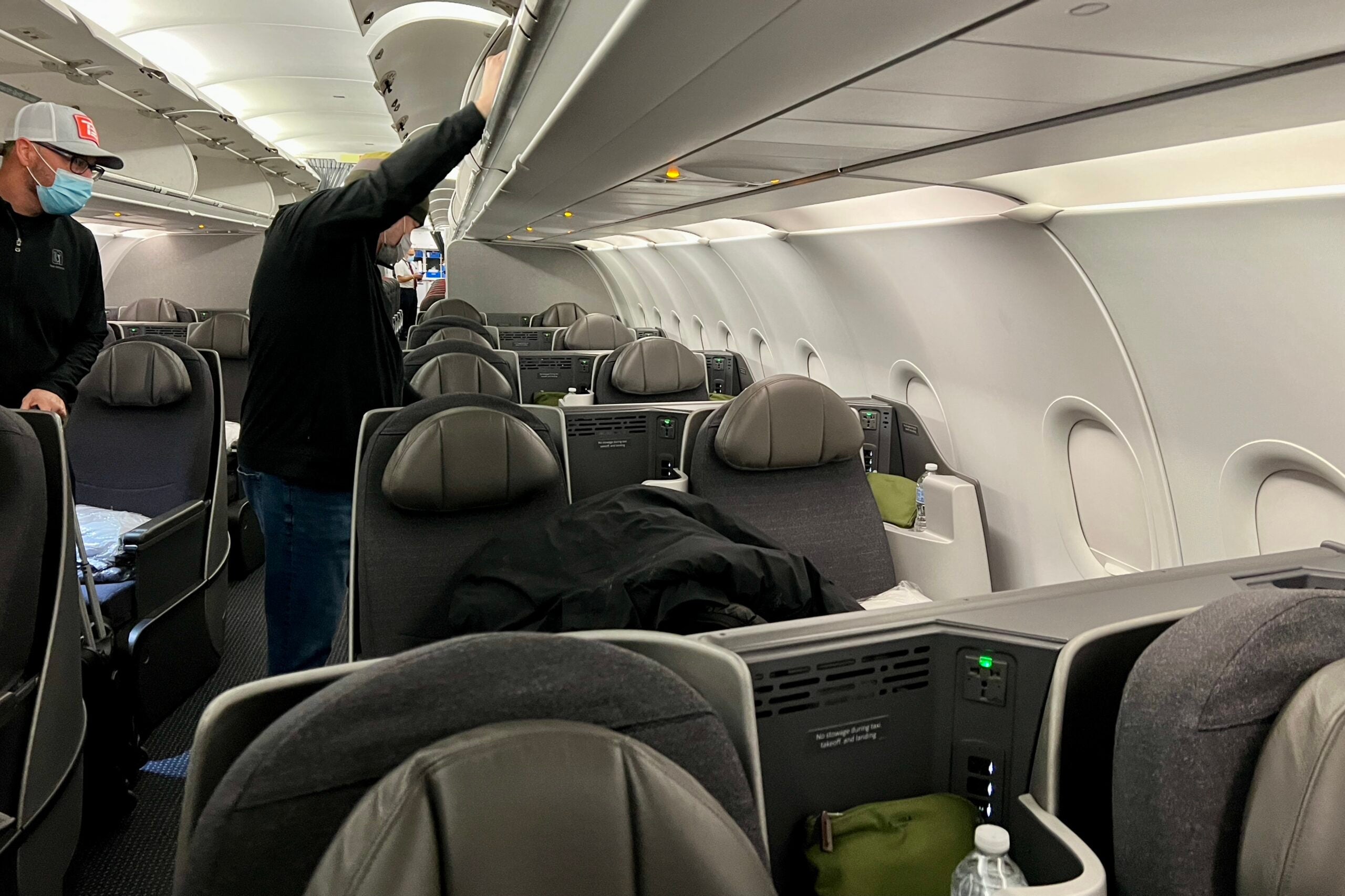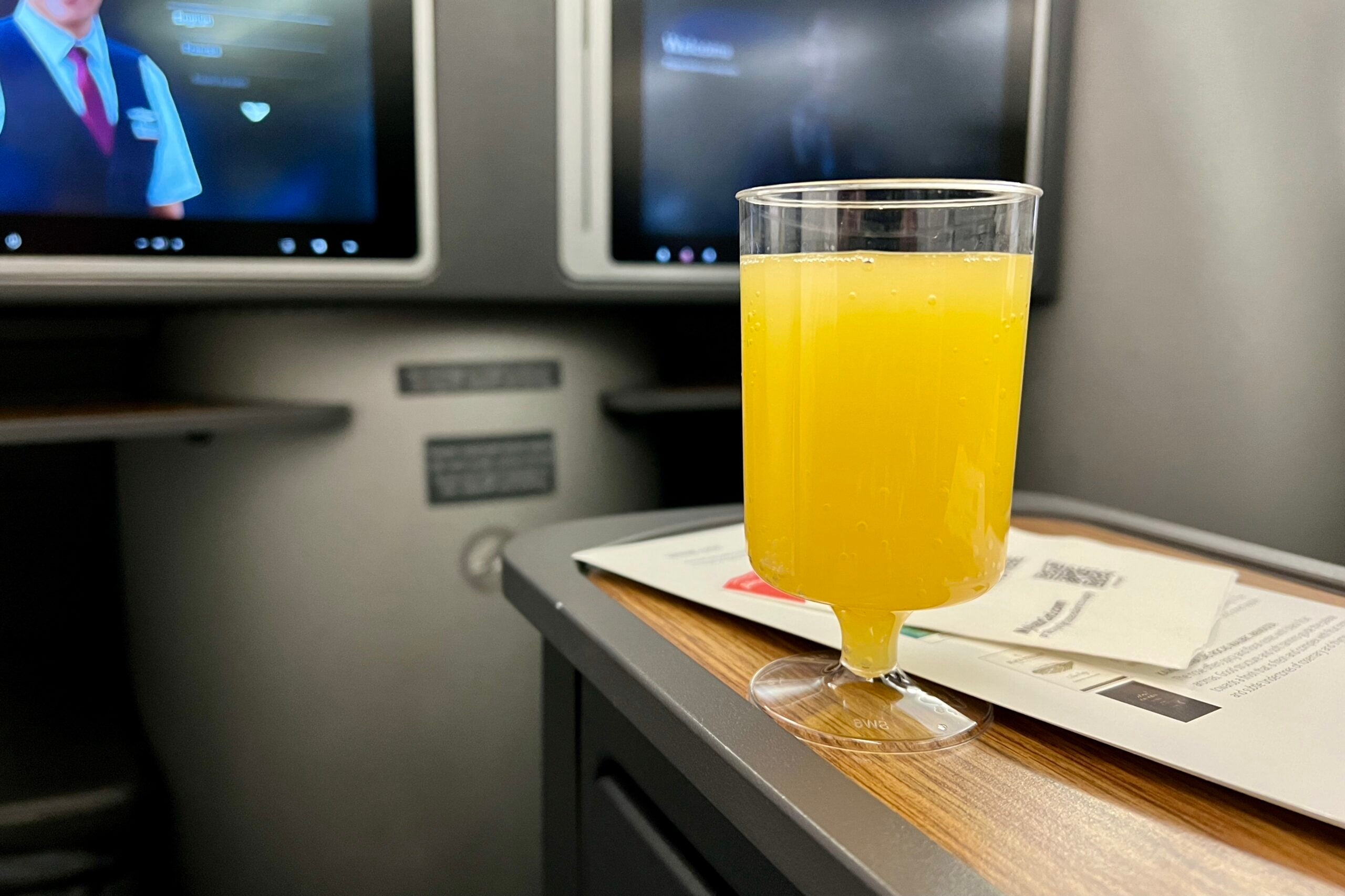 The business-class cabin on the A321T is arranged in a 2-2 configuration. I found my seat, 7A, a port-side window seat, and settled in. A flight attendant came by within a few minutes to offer a predeparture beverage choice of orange juice, Champagne or a mimosa. I went with the latter, because why not?
