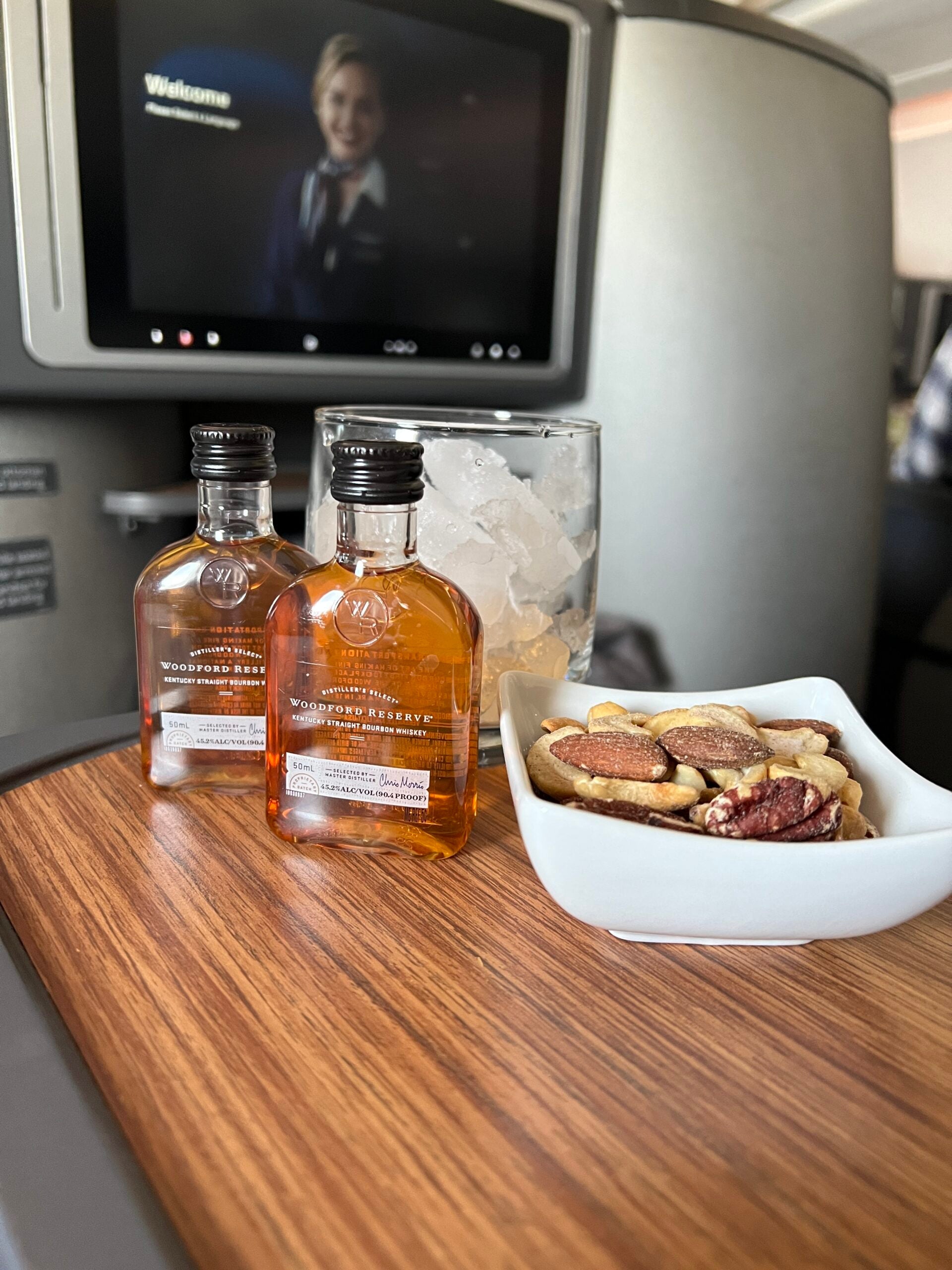 One thing I appreciated on this flight was the flight attendants. They all seemed happy — maybe it was the holidays coming up, and the associated bonuses — but everyone was attentive, fun and chatty (in a good way). I asked for a Woodford Reserve during the initial drink service, and the flight attendant brought me two — and kept bringing another minibottle every time she passed through the cabin ("Why not make it a party," she asked).