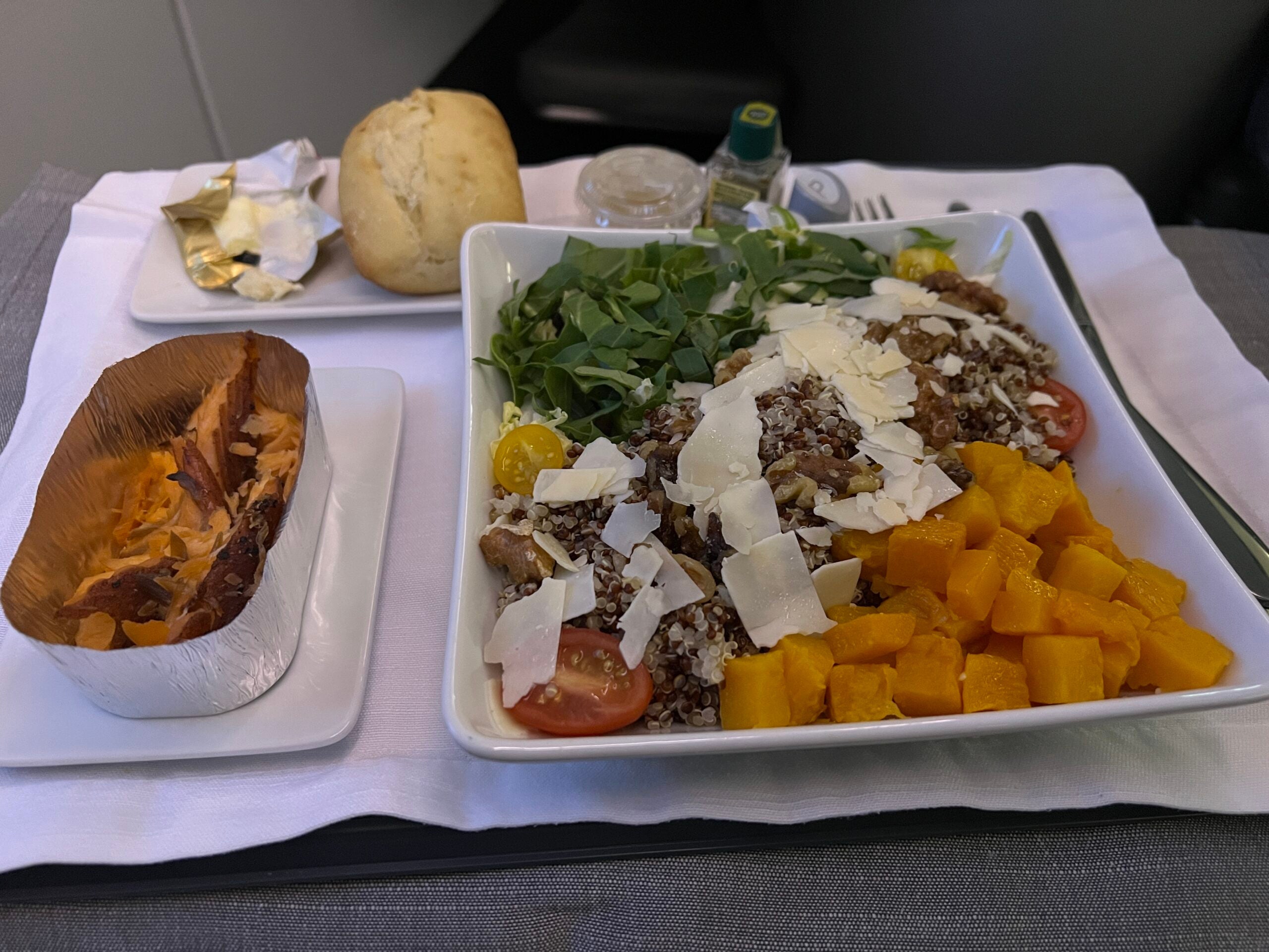 After takeoff, the flight attendant came by to take breakfast orders. There was an egg and fire-roasted corn enchilada on the menu, but it had been replaced with a cheese and tomato omelet, which turned out to be delicious. As soon as I finished breakfast, I put my seat back and slept through the rest of the flight.