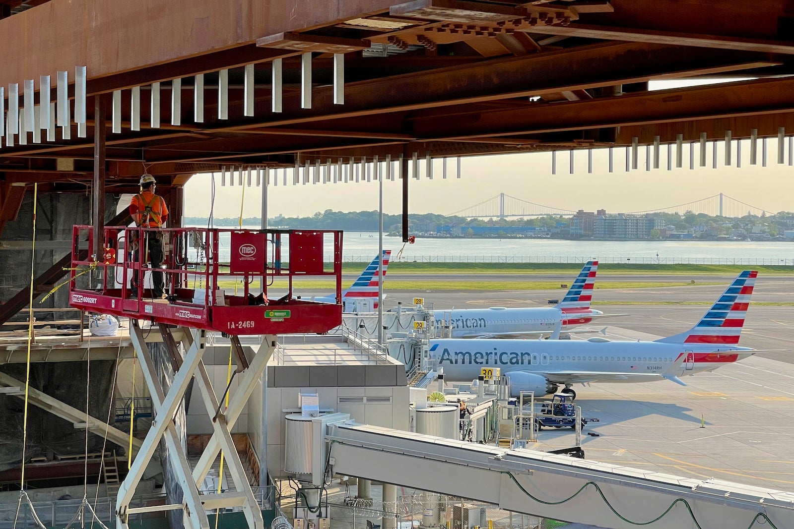 The dual pedestrian bridges — a first in any airport worldwide — were built high enough so planes could taxi underneath them, creating nearly 50% more taxiway space at LGA. Additionally, thanks to the new design, jets can now go either direction along the new taxiway.