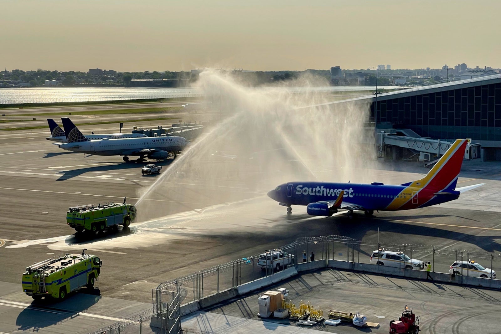 Two firetrucks sprayed the Southwest jet with an honorary water cannon salute moments after it passed under the eastern sky bridge. Before long, the jet was on its way to Tampa at 7:39 a.m. local time.