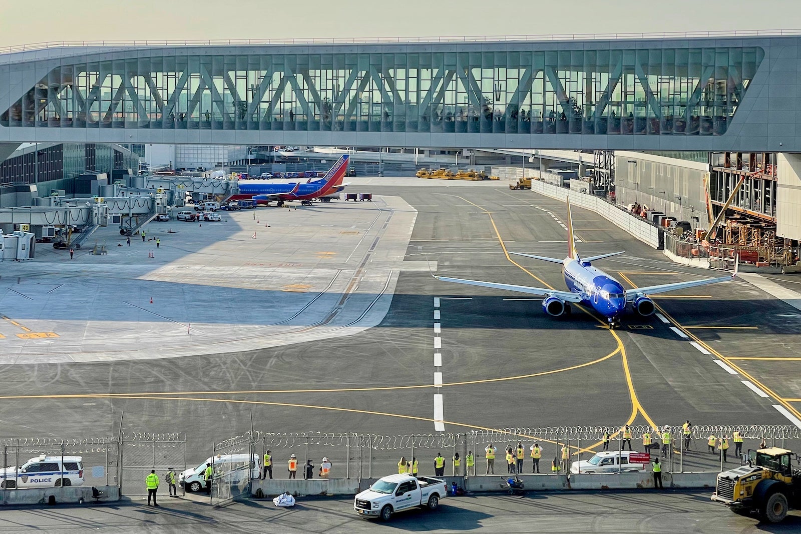 Southwest Flight 617, operated by a 21-year-old Boeing 737-700, registered N767SW, became the first aircraft to use the new taxiway. A group of executives and other invited guests gathered on the western sky bridge to watch the event unfold.