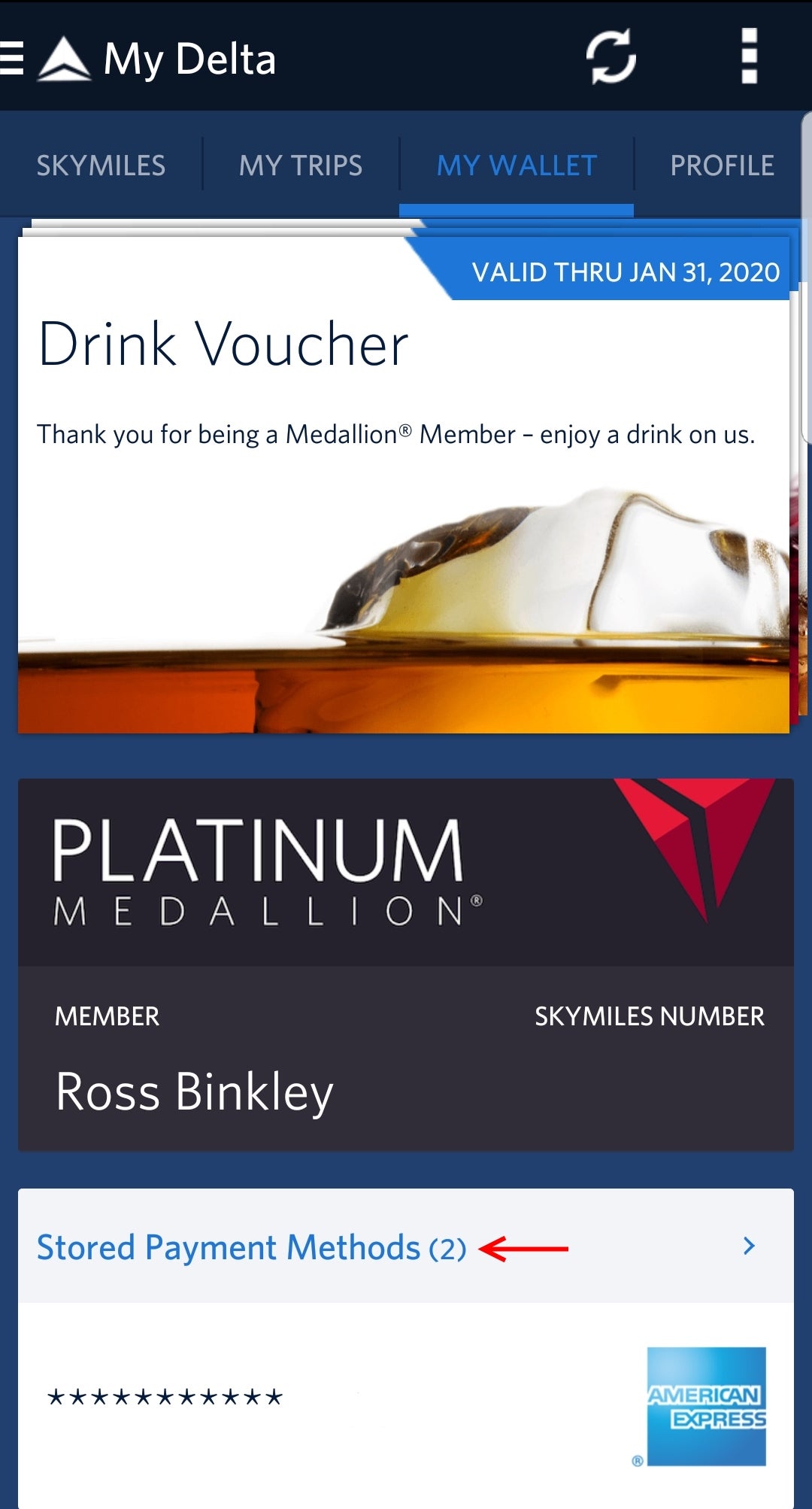 Alternatively, you can use the Fly Delta app to add your Platinum Card account to your Delta wallet. From the "My Delta" screen, select the "My Wallet" tab and then tap "Stored Payment Methods." On the "Stored Payment Methods" screen, click the "Add Another Payment Method" link and enter your Platinum Card account information.