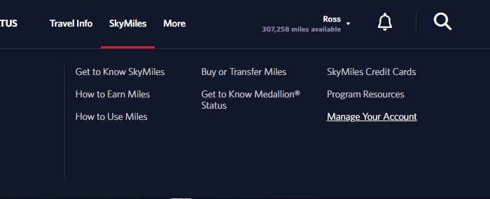 To add your Platinum Card to your Delta wallet on the website, first, log in to your SkyMiles account on delta.com. Once you've logged in, click the "Manage Your Account" link under the "SkyMiles" menu at the top of the page, which should take you to your "My Delta" dashboard.