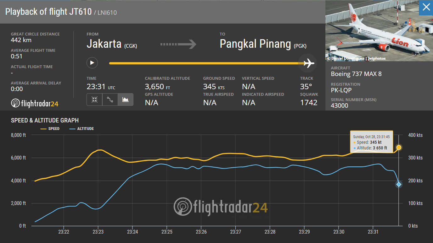 Indonesian officials confirmed Monday morning that a Lion Air Boeing 737 MAX 8 (registration PK-LQP, MSN 43000) lost contact with local air traffic control and crashed shortly after departure from Jakarta, Indonesia (CGK). The aircraft was operating Lion Air flight 610 from Jakarta to Pangkal Pinang (PGK).