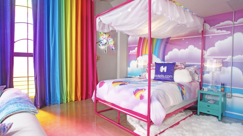You can book the ’90s-inspired Lisa Frank rainbow room of your childhood dreams
