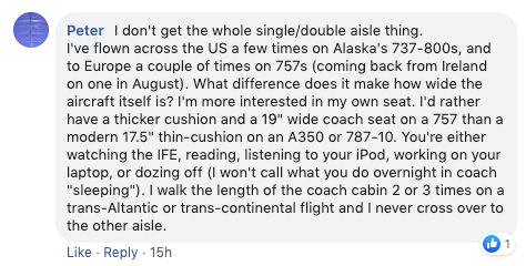 One reader even compared flying on a narrow-body to the luxury of the single-aisle upper deck of a Boeing 747.
