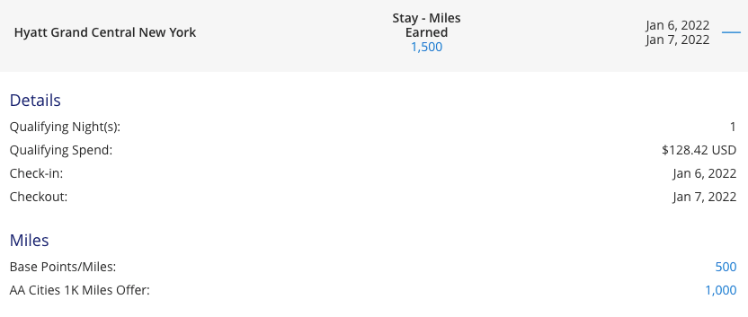 With my one-night stay at the Hyatt Grand Central New York, I earned 1,500 redeemable AAdvantage miles. While I earned AAdvantage miles -- and likely 500 Loyalty Points -- I also received credit for one elite night toward the World of Hyatt program.
