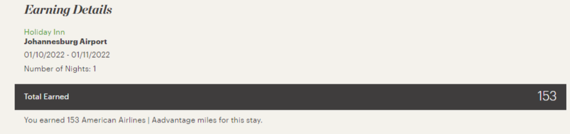 TPG's Katie Genter stayed at the Holiday Inn Johannesburg Airport and earned 153 redeemable AAdvantage miles, along with an elite night that counts toward IHG status.