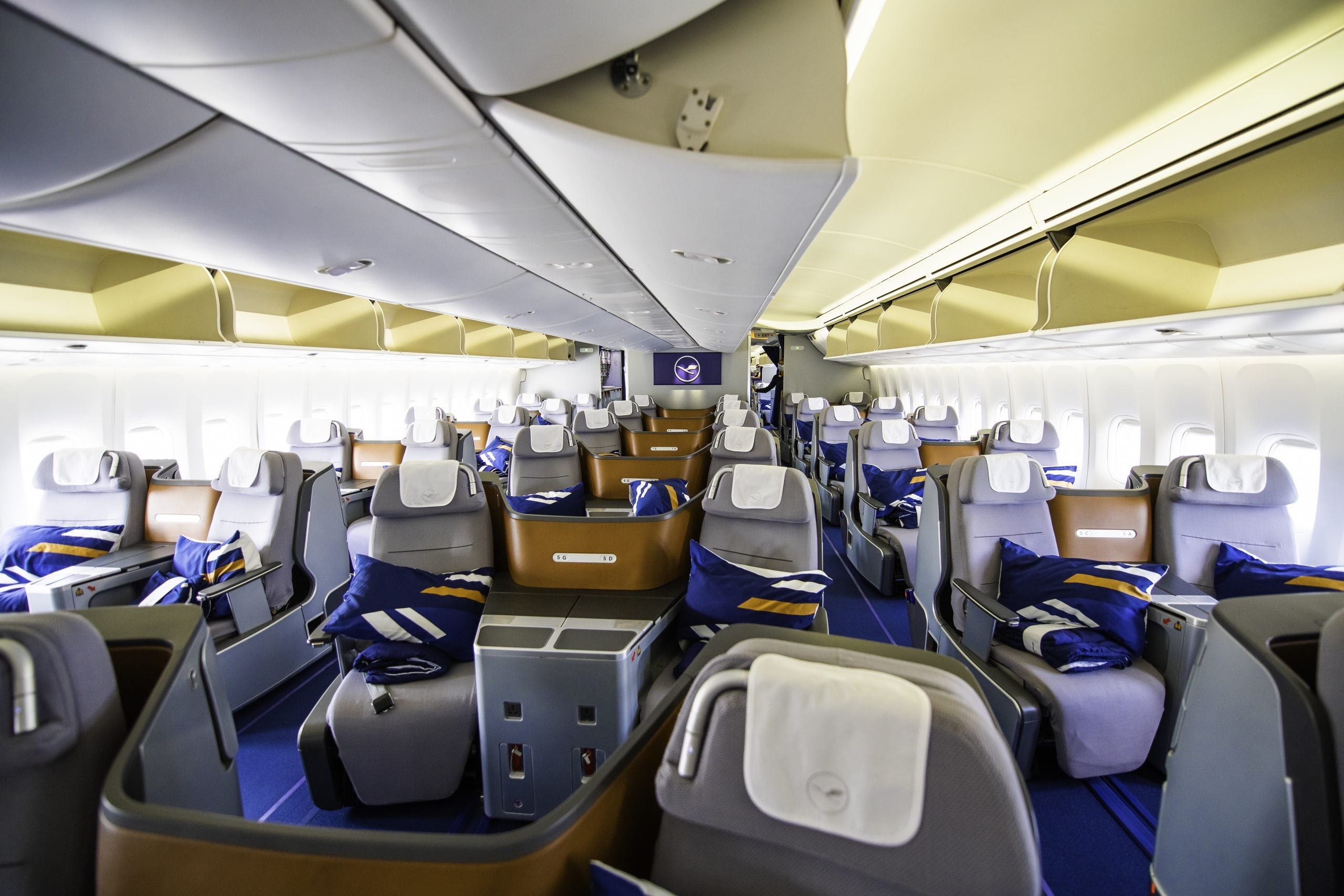 These specific planes were previously used by Philippine Airlines, and Lufthansa didn't retrofit the cabin interiors with new business-class seats. Instead, it put seat covers with its signature blue, white and orange color palette throughout the cabin.