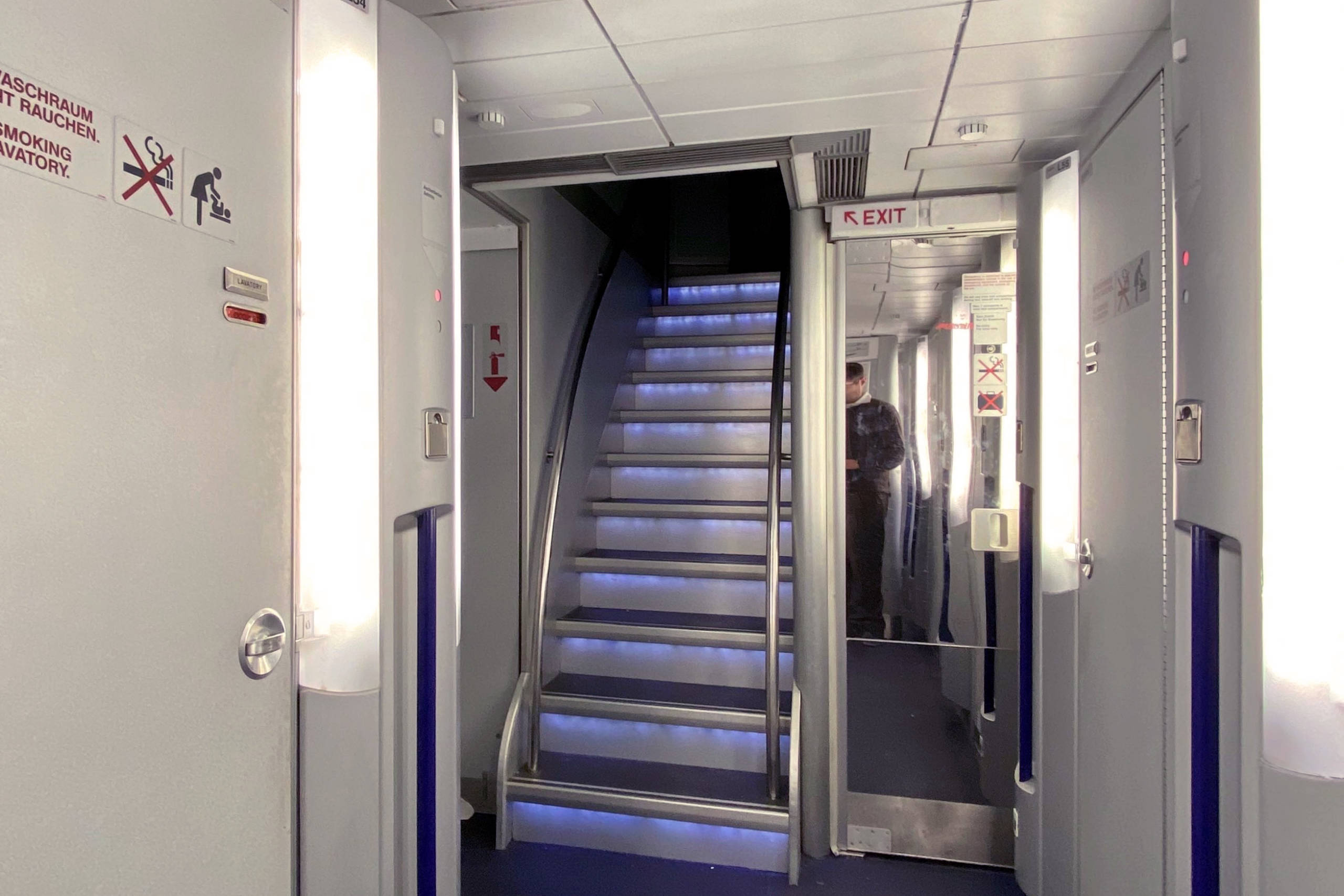 I wouldn't go so far as to call this a special amenity — it's a bank of fairly standard economy lavatories, after all — but, for enthusiasts, at least, it could be worth seeking out this plane for the novelty of being able to walk up and down a flight of stairs at 30,000 feet.