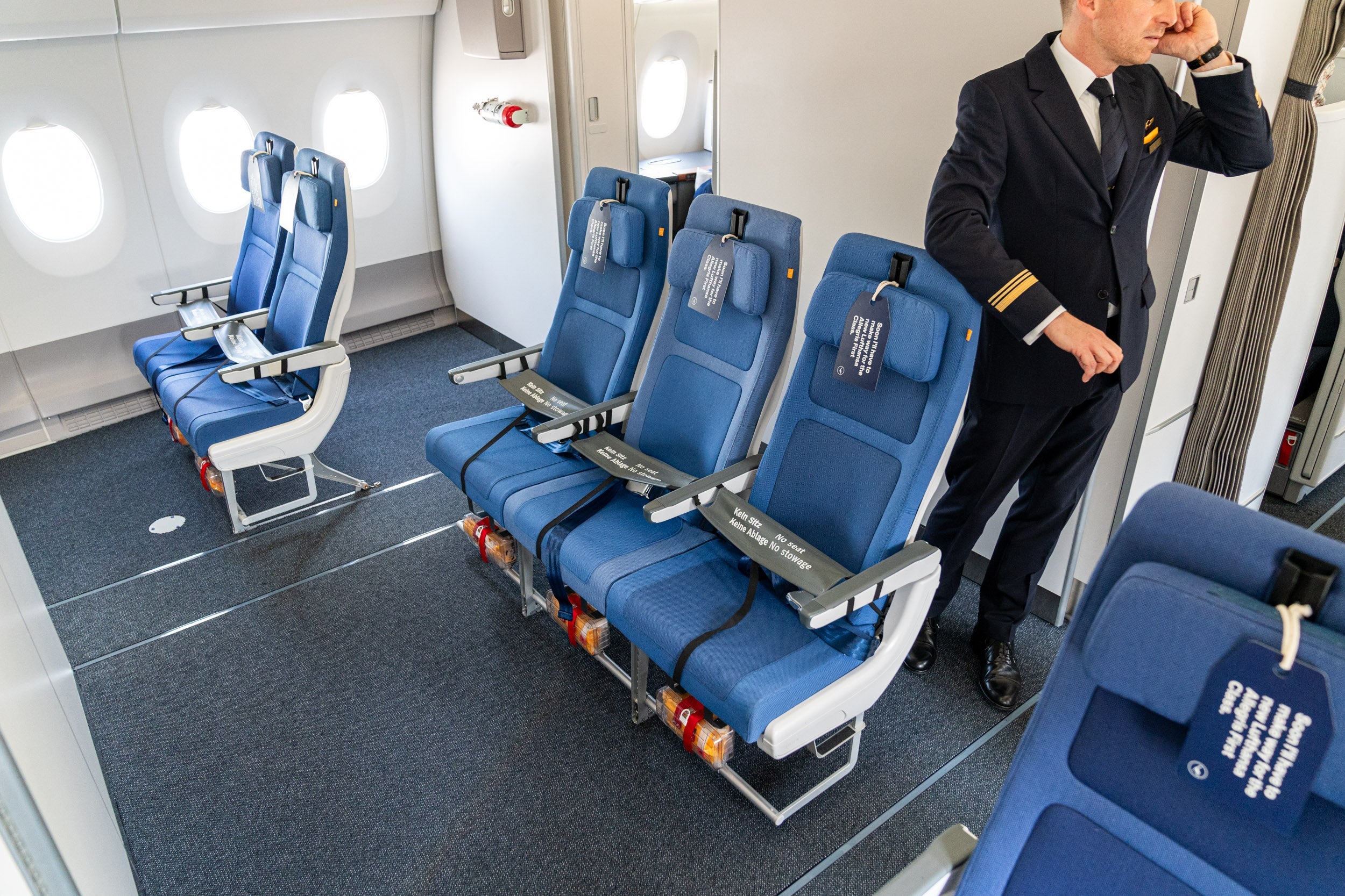 As for those placeholder economy seats? Those were installed to meet requirements for cabins to offer places for crewmembers to grab hold of something in the event of turbulence, but the airline did not bother to certify them for passenger use since they're temporary.