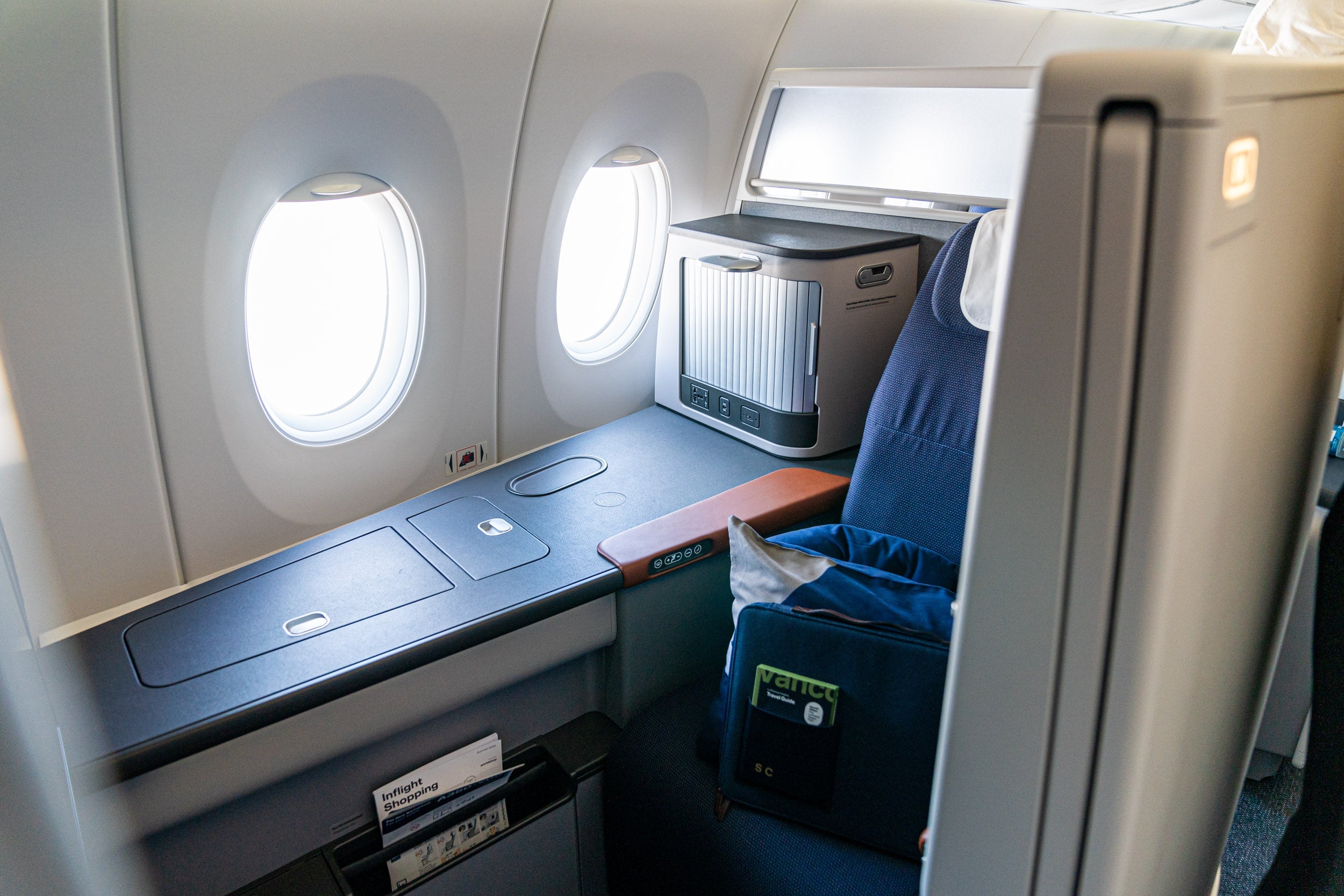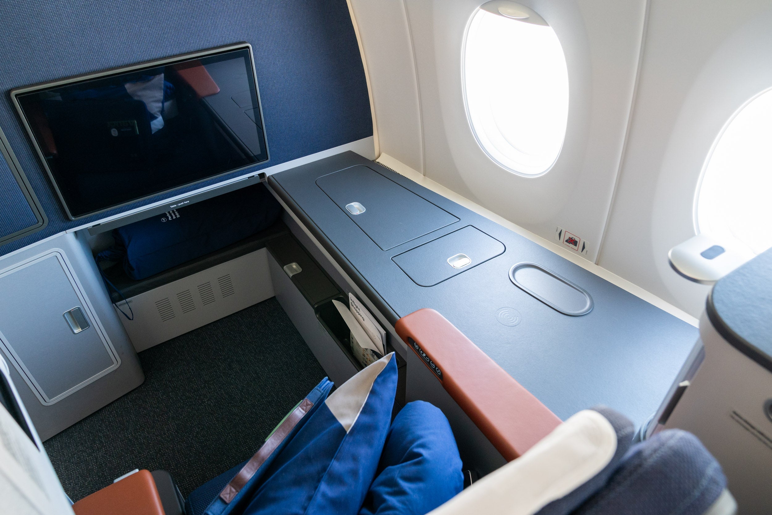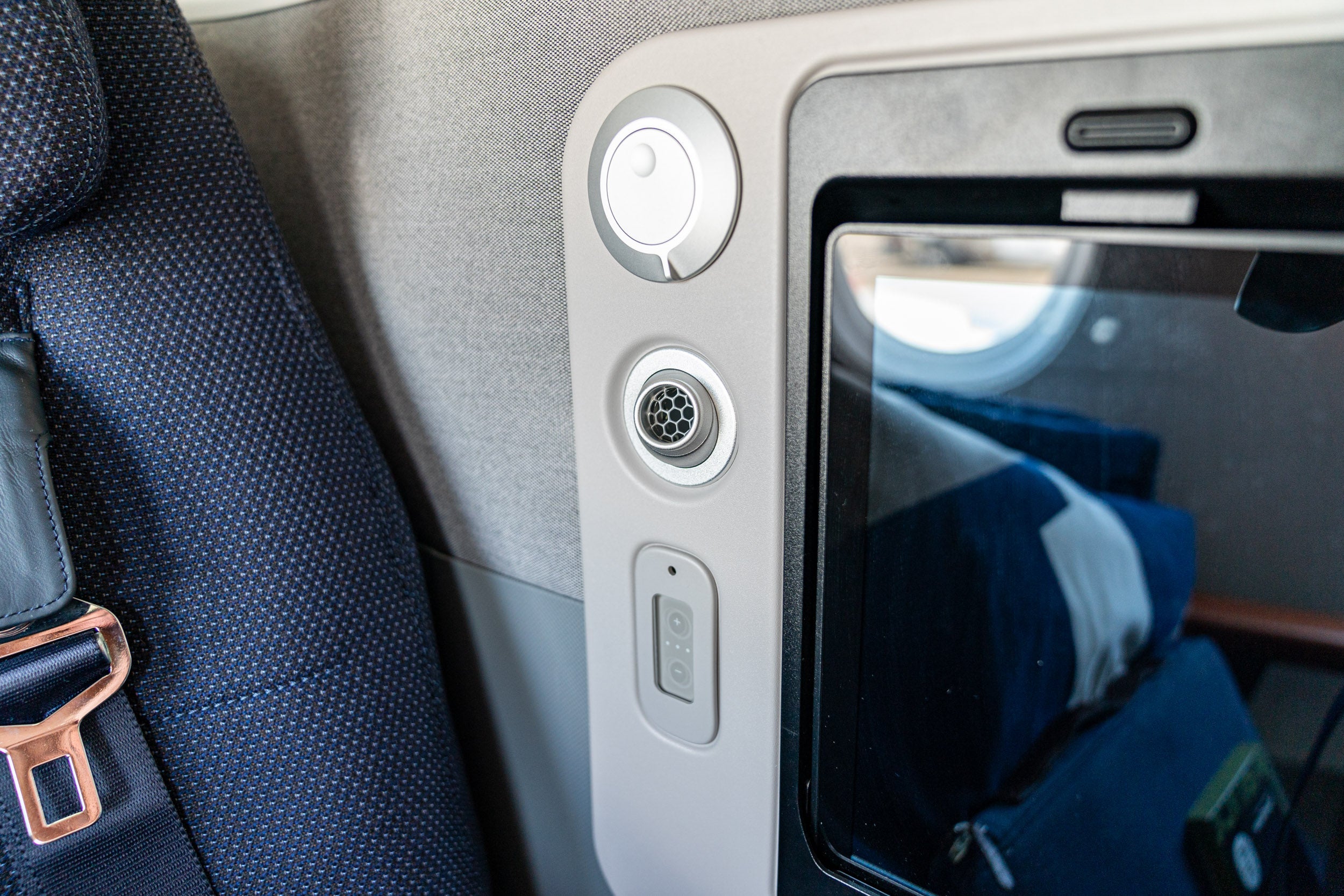 Also on the right, a bit further back, were a few of my favorite features. There was a tablet that you could use to control the seat, lights, climate settings and inflight entertainment screen. At first, this seemed a bit extraneous since the main screen is touch-controlled, but I realized a bit later during the flight that it's actually in the perfect spot to control things while your seat is in the lie-flat bed position, whether you want to watch a movie before falling asleep or you decide you're too hot or cold.