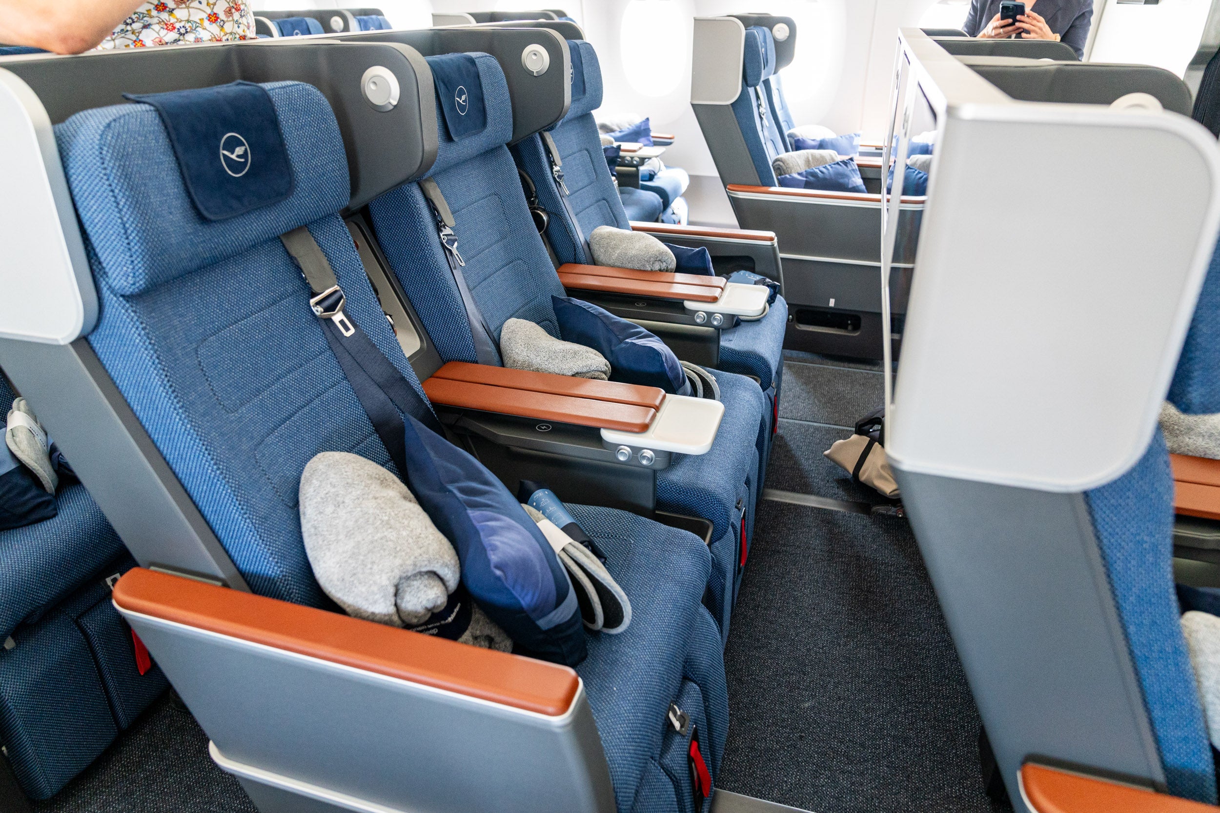 Three rows of premium economy seats at the windows — and four in the middle — sit in a 2-3-2 layout.