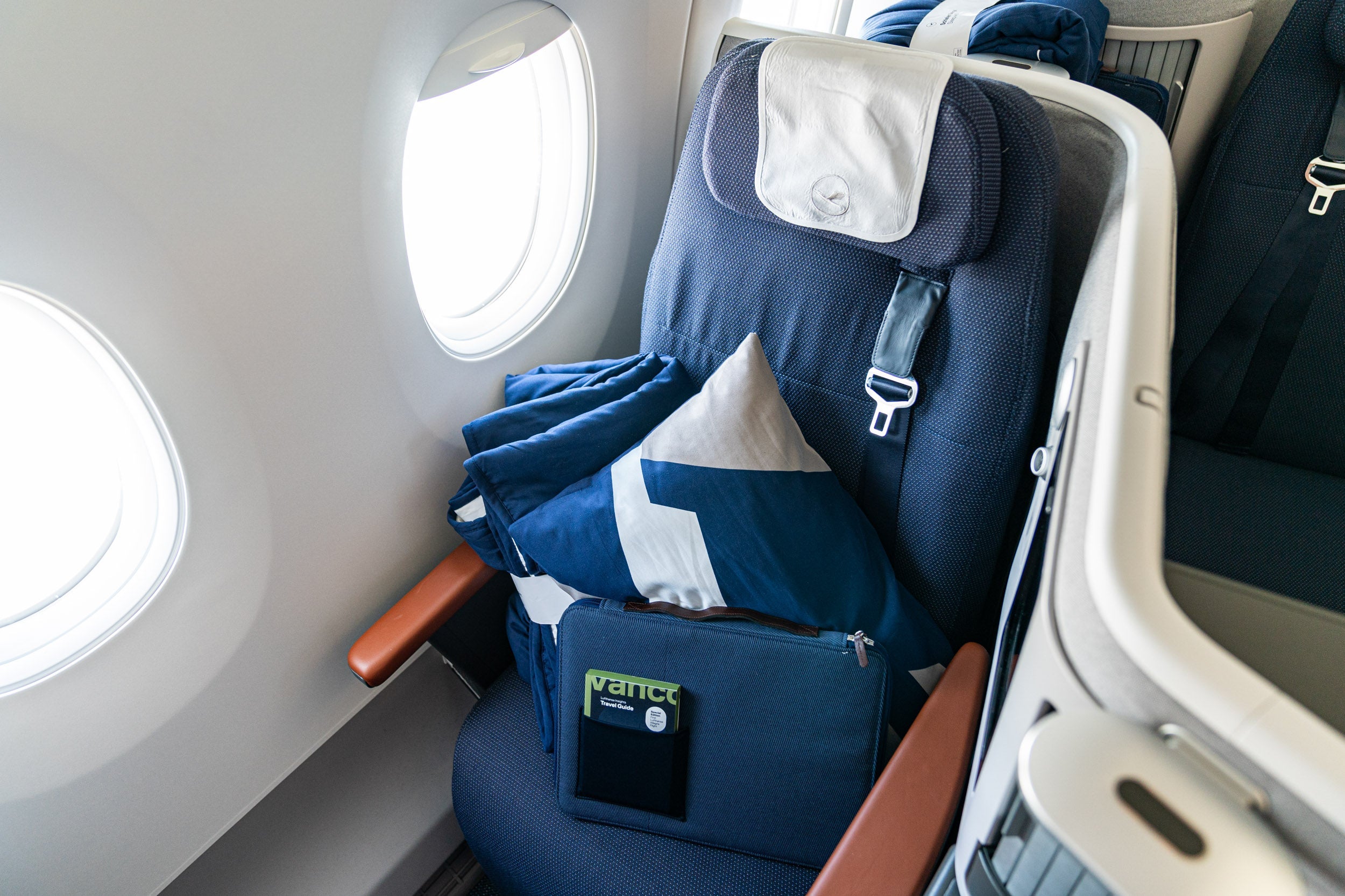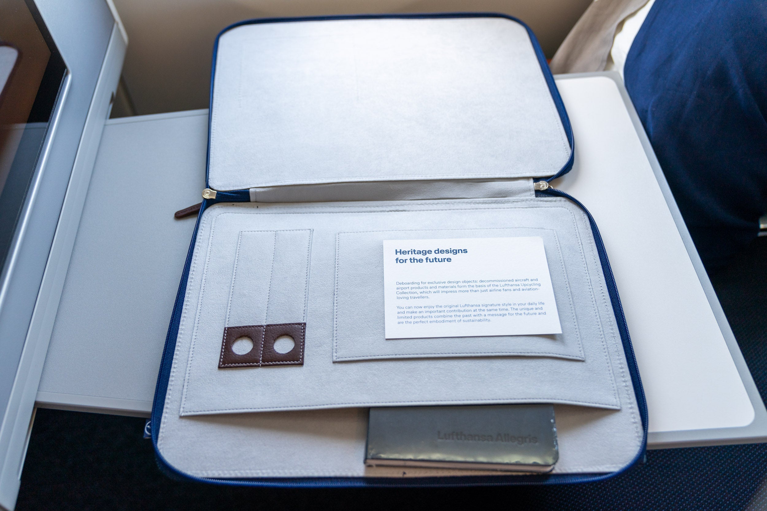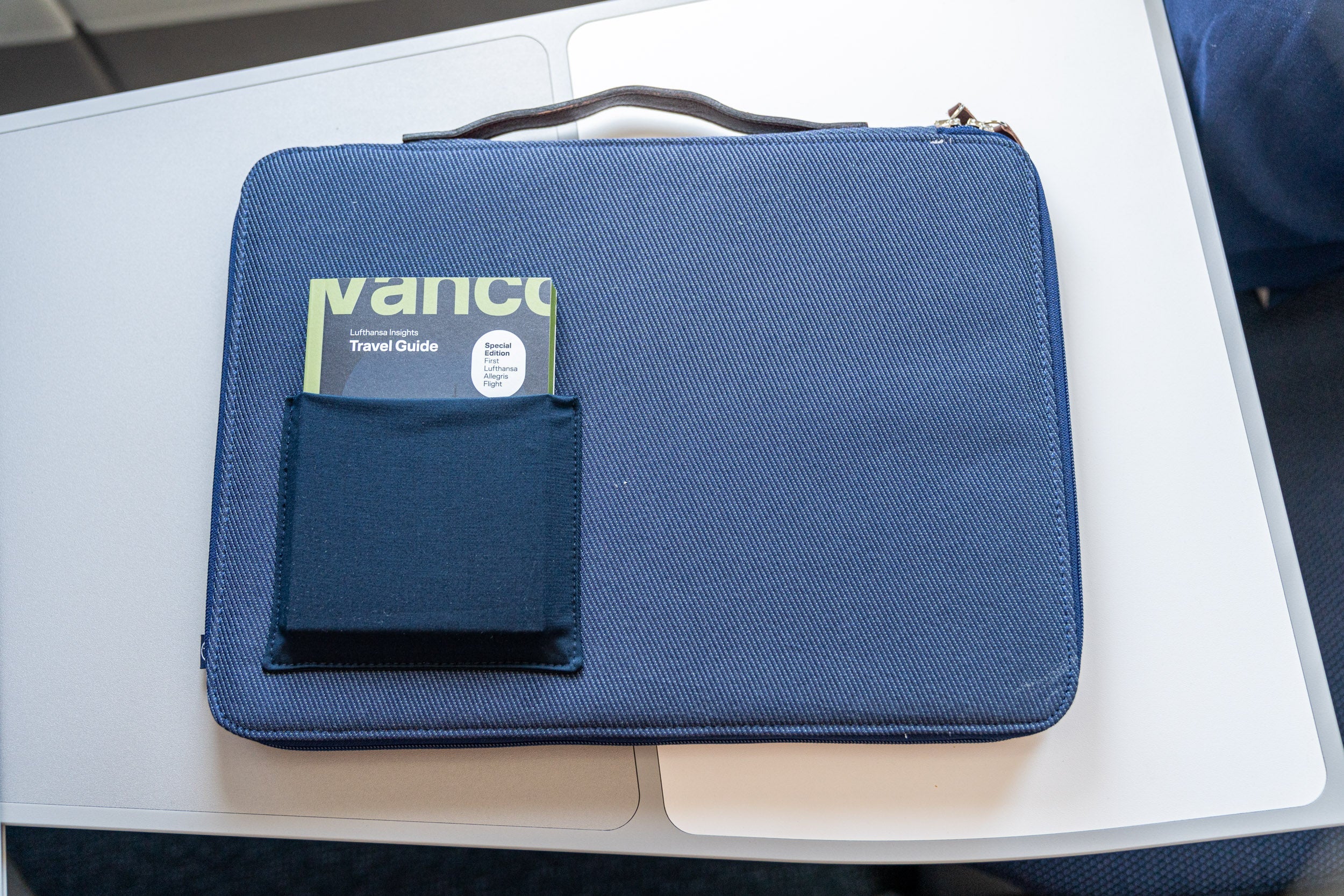 Along with the amenity kit, a pillow and a blanket were waiting on the seat. There also was a special souvenir for the first Allegris flight: a laptop sleeve/folio containing a notebook and a special edition of Lufthansa's in-house travel guide to our destination.