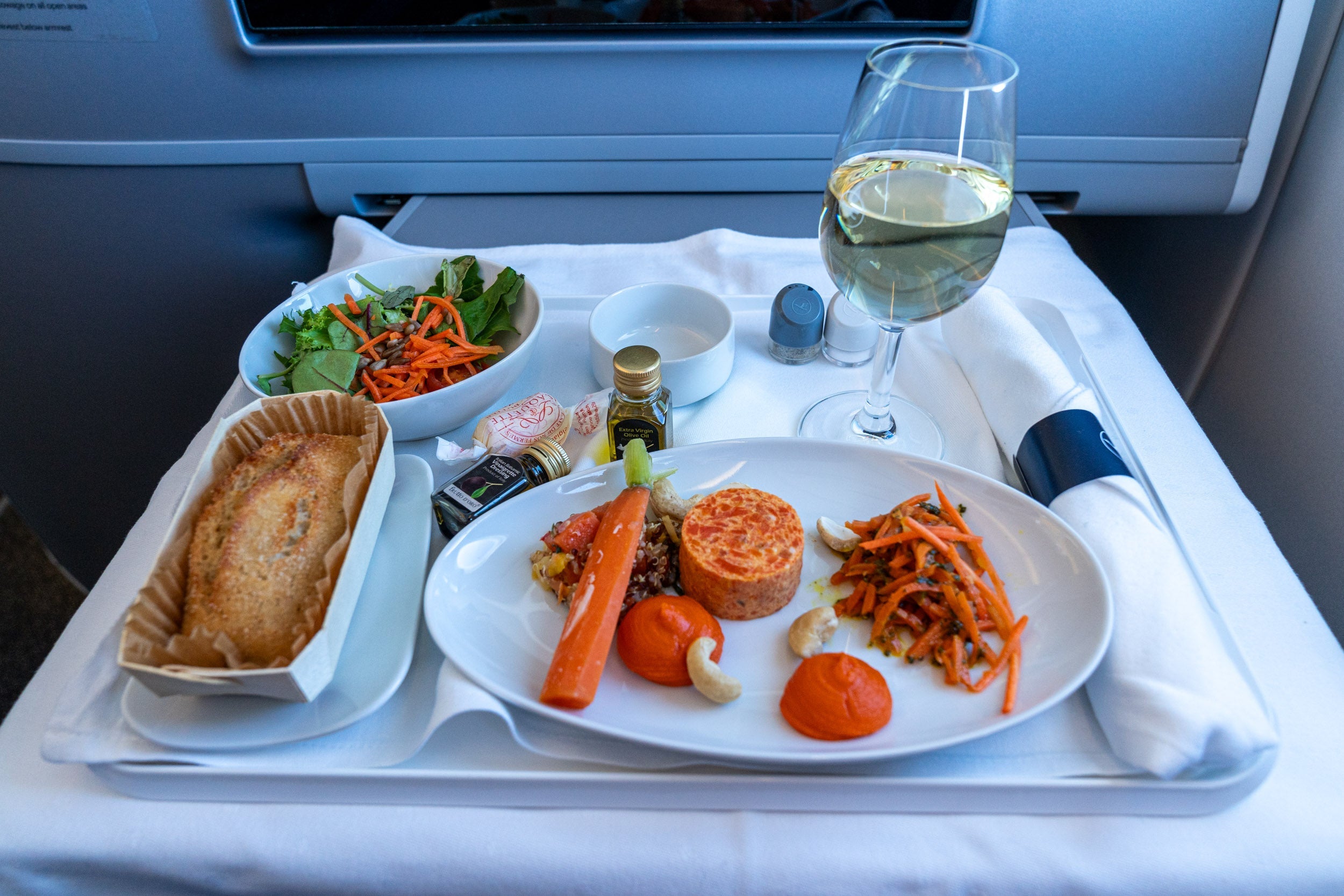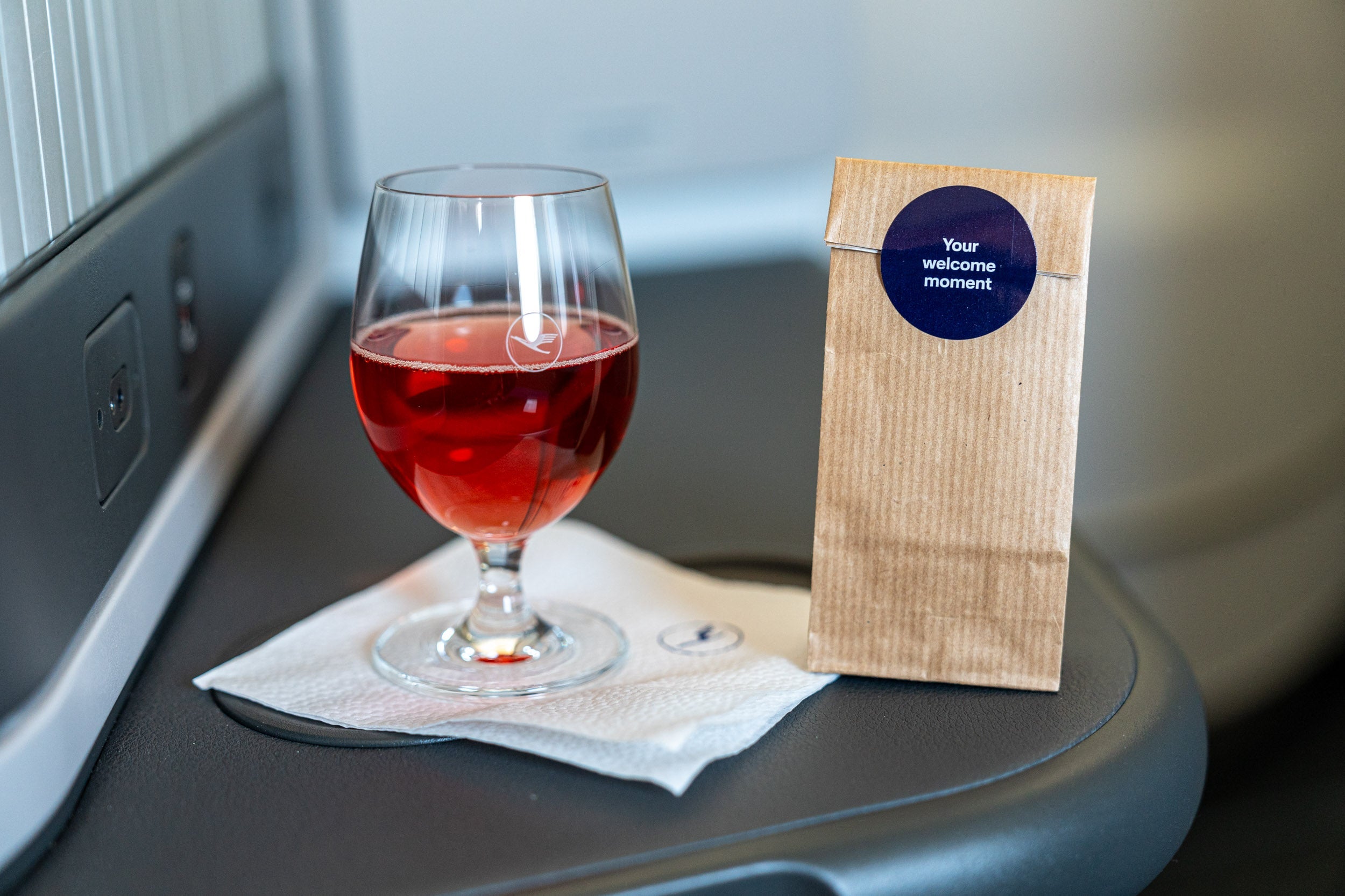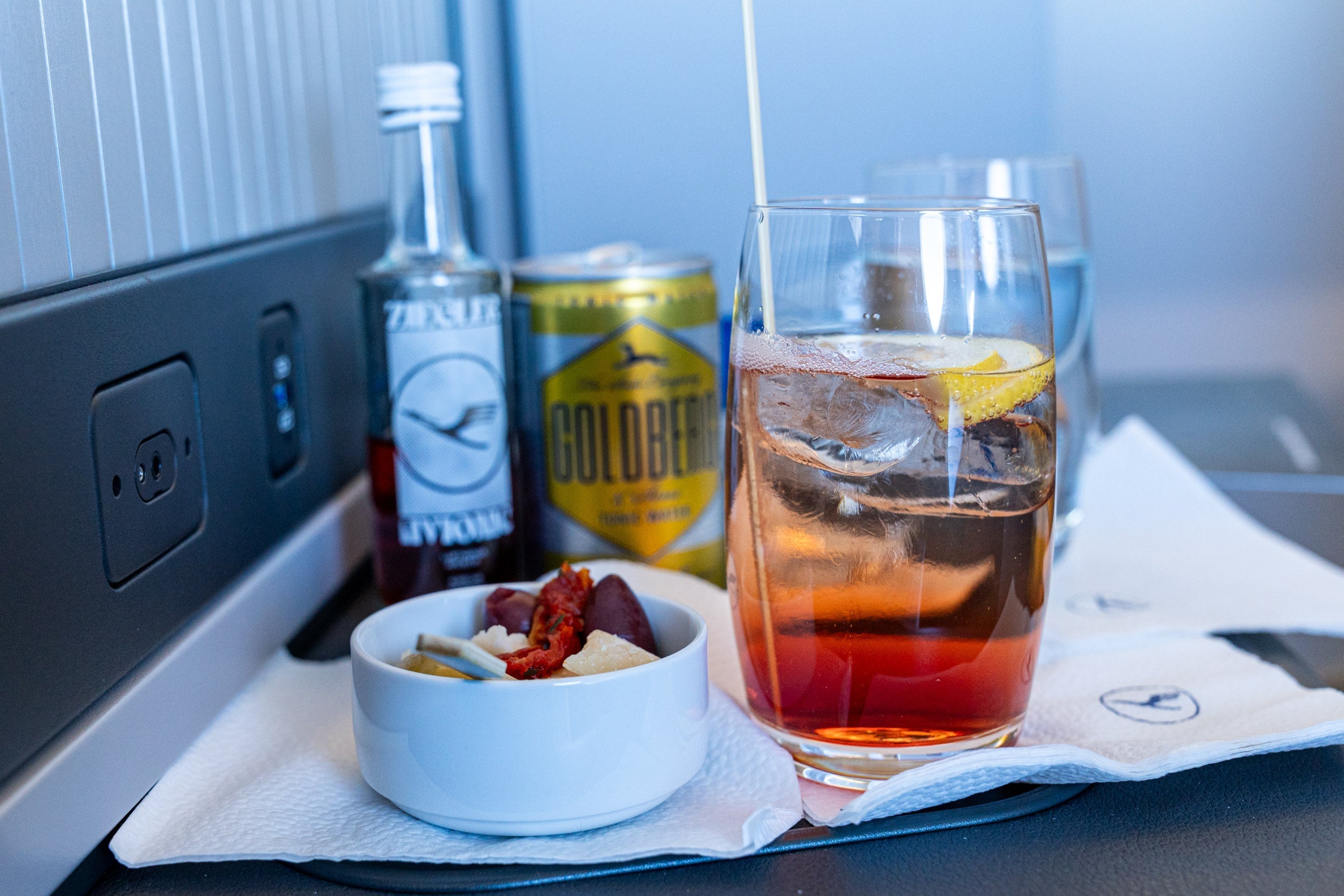 A choice of welcome drinks was offered on board, along with a bag of mixed nuts. I went with the Avionic, a new aperitif the airline designed with the Ziegler distillery in Freudenberg, Germany. It's an herbal bitter similar to Aperol that's mixed with tonic water and served on ice with a slice of lemon.