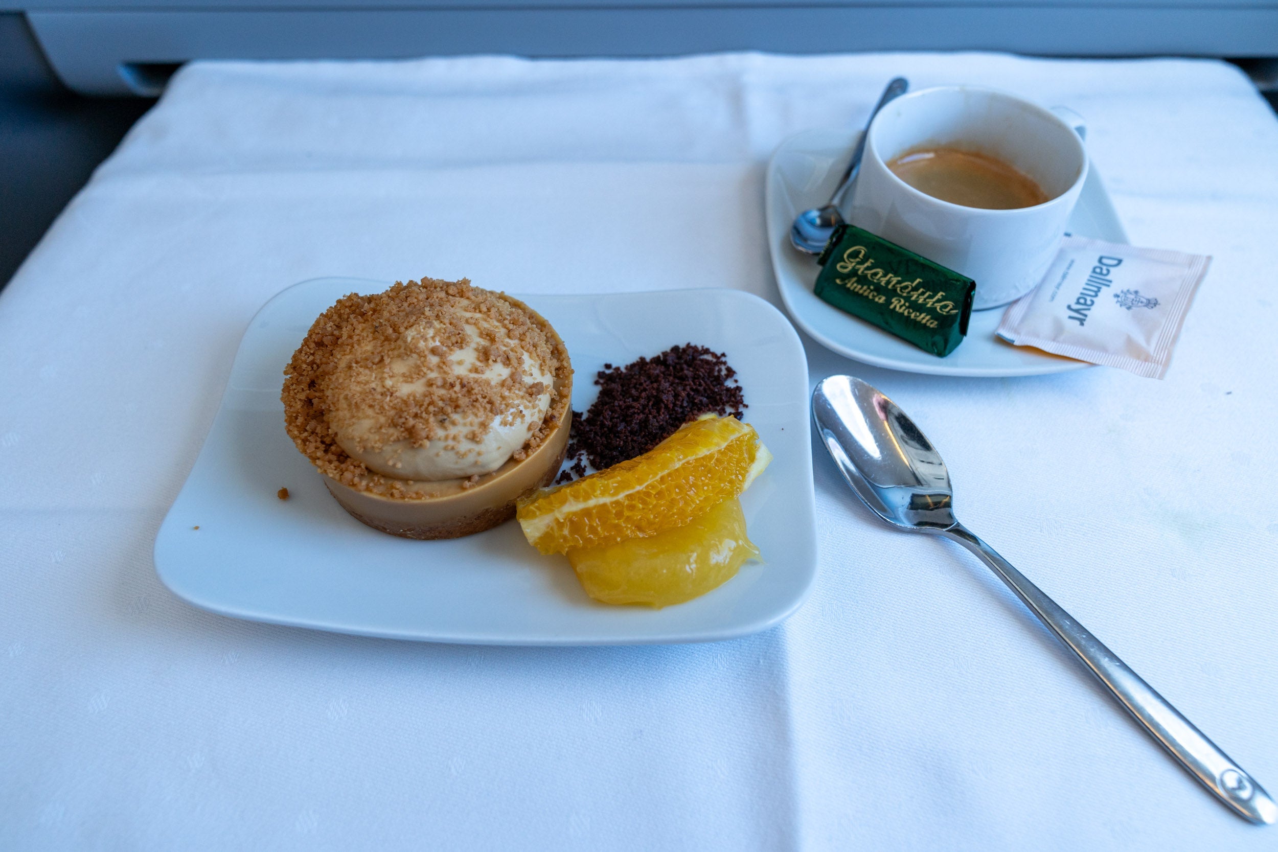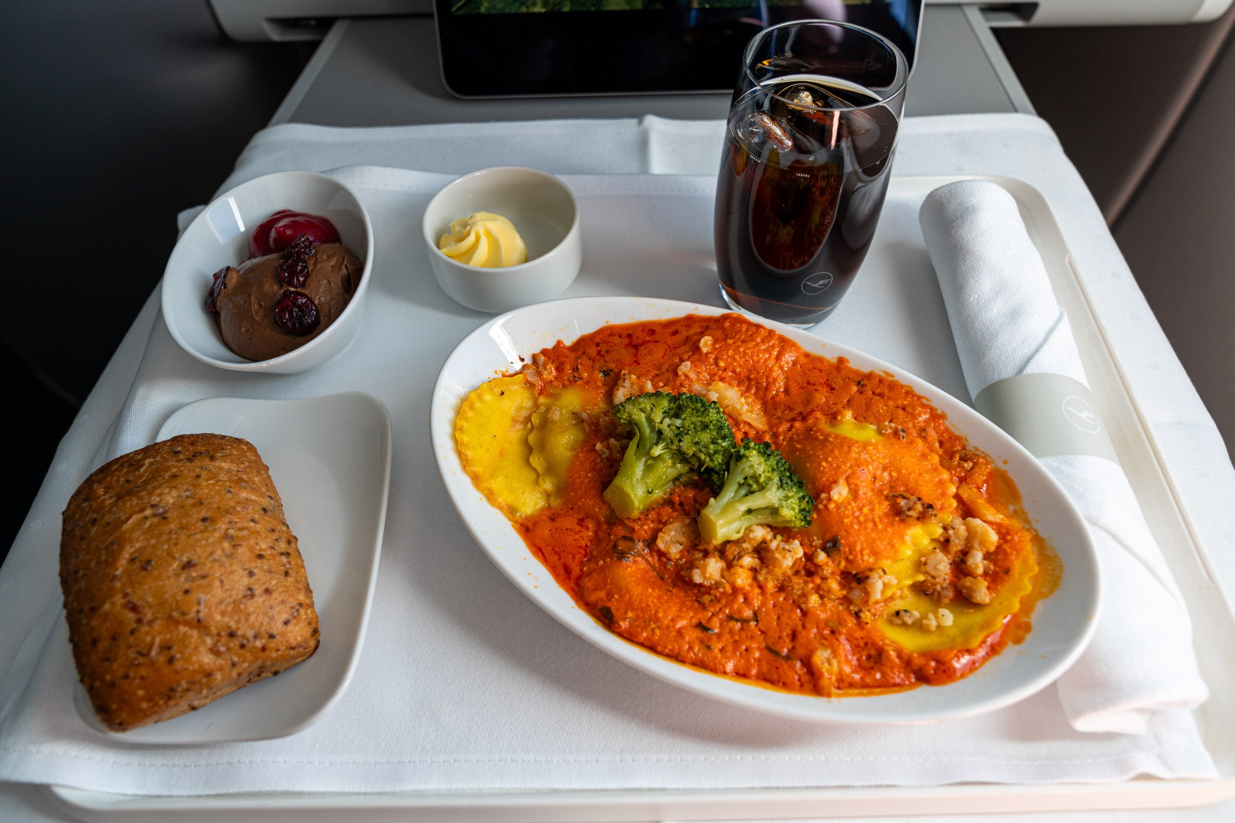 About 90 minutes before landing, the flight attendants offered a light dinner. I chose the tortellini, which was a solid choice. The chocolate mouse dessert was delicious as well.