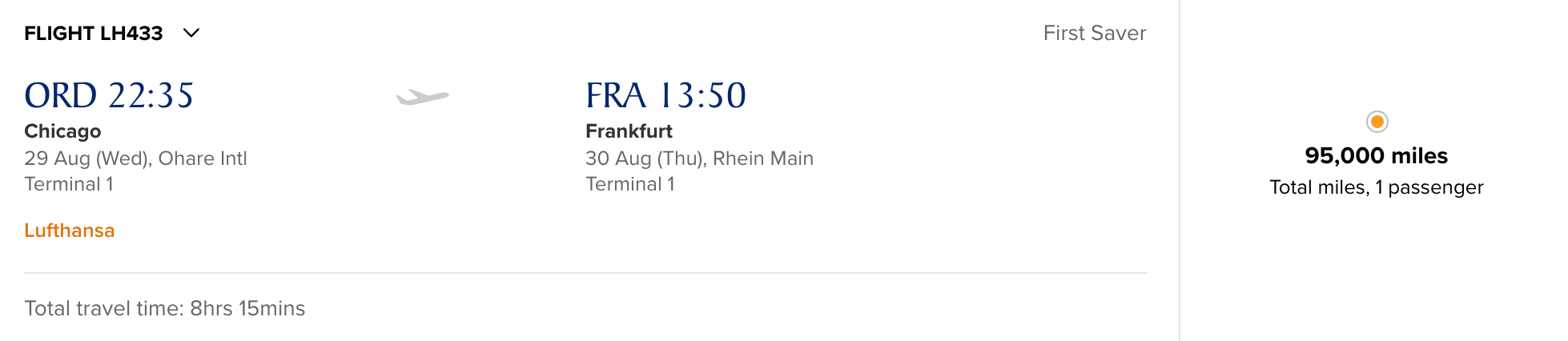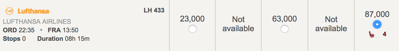 In April, Lufthansa First award space was showing up only on one US-based route — between San Francisco (SFO) and Munich (MUC). Now, Lufthansa appears to be releasing more space — including up to four first-class seats on its route between Chicago (ORD) and Frankfurt (FRA). Your best bet is to search for space either through Avianca's LifeMiles program for 87,000 miles one-way...