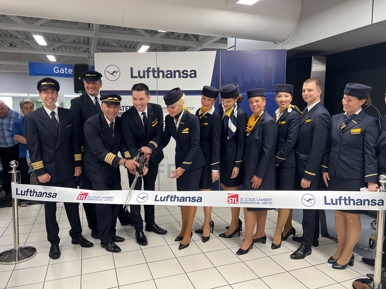 Later in the day, a ribbon-cutting took place at Lufthansa's gate — E29. The ribbon was actually cut twice: once by leaders and once by the flight crew.