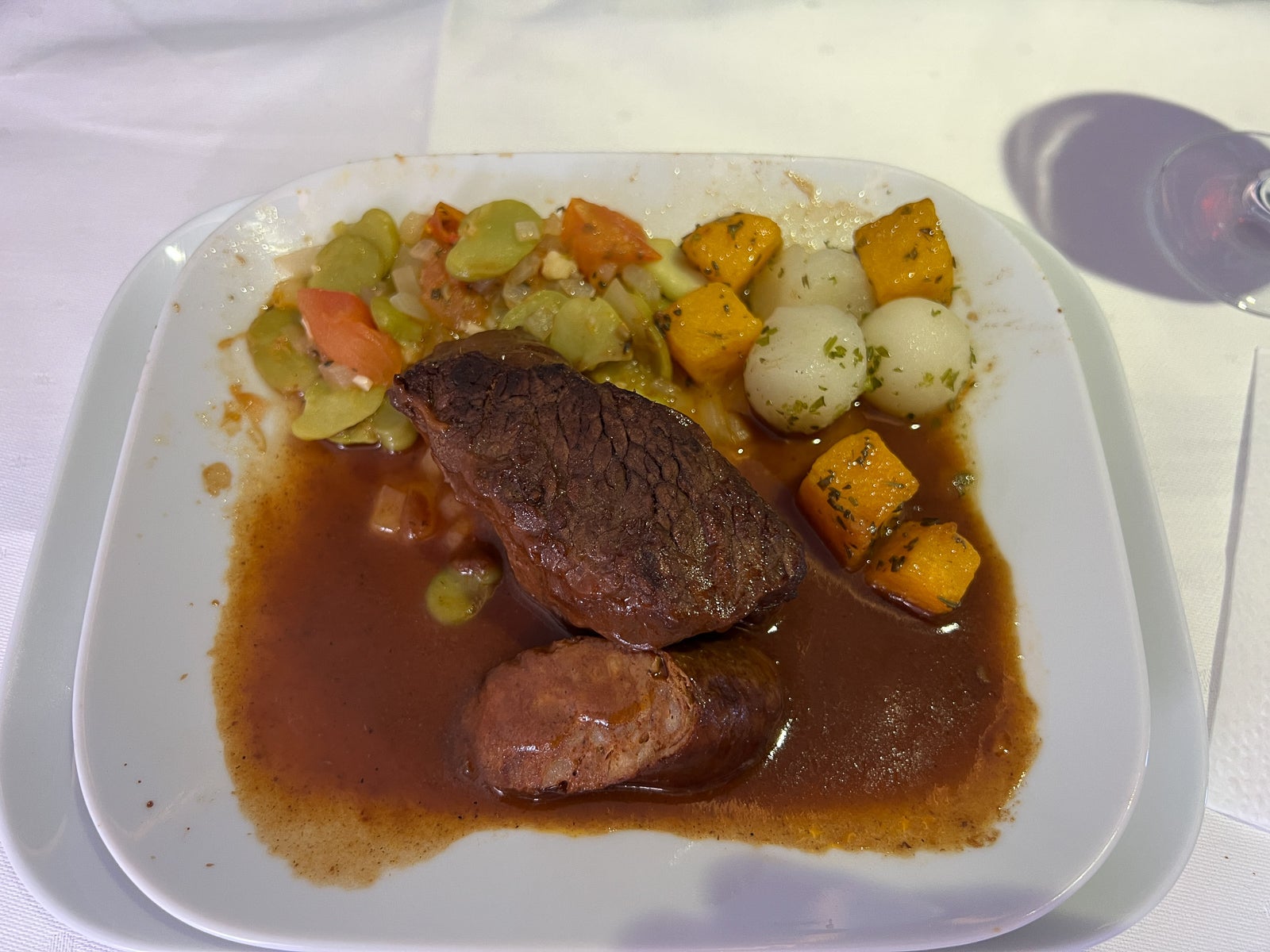 For the main course, the choices were braised beef short rib, salmon or ravioli. I selected the beef, which is sometimes a risky bet on an aircraft. Although it was cooked a bit more thoroughly than I would have liked, I really enjoyed this dish; it was paired with a burgundy sauce, chorizo, broad bean cassoulet and Parisian potato.