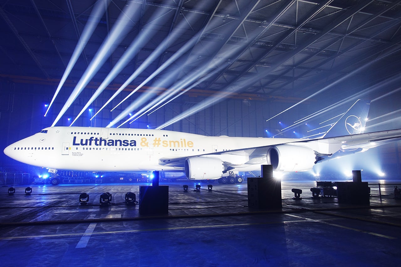 At an event later Wednesday evening in a Frankfurt airport hangar, Lufthansa executives revealed the new livery in public for the first time. The 747-8, the backbone of Lufthansa's long-haul fleet, was shown in a snazzy display, and Lufthansa employees roared when the lights finally pointed towards the jumbo jet.