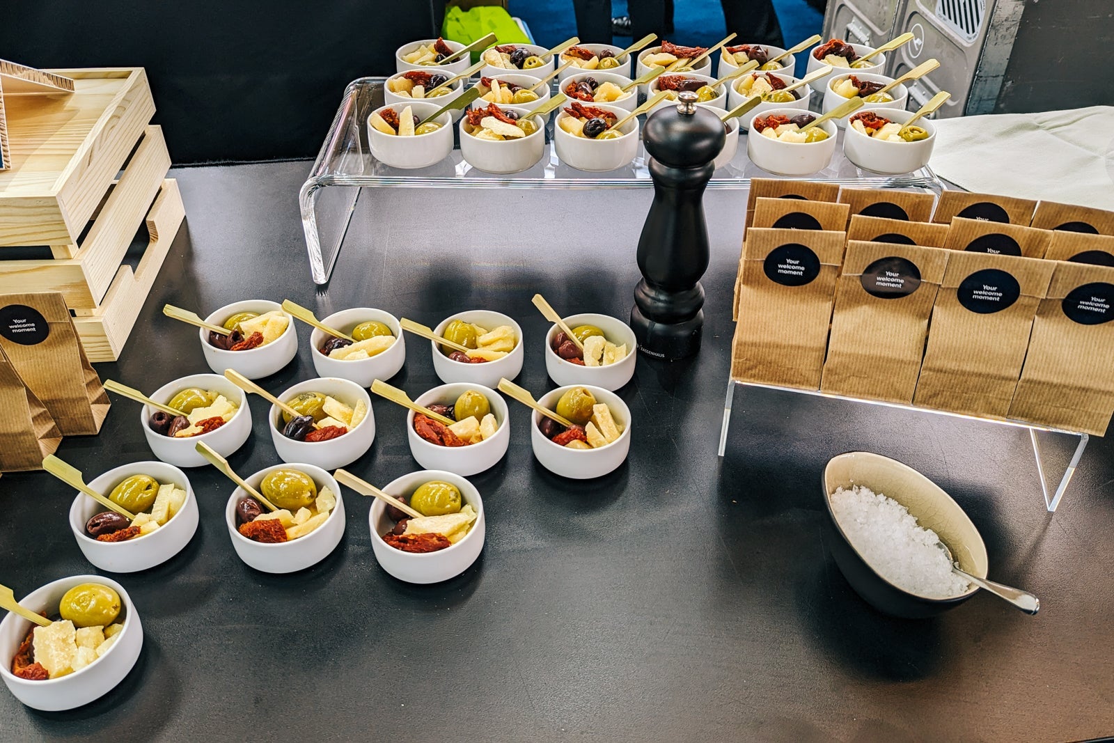 Passengers in business class will now be served an amuse-bouche before the meal, with a small bowl of cheese and olives on display for the preview event.