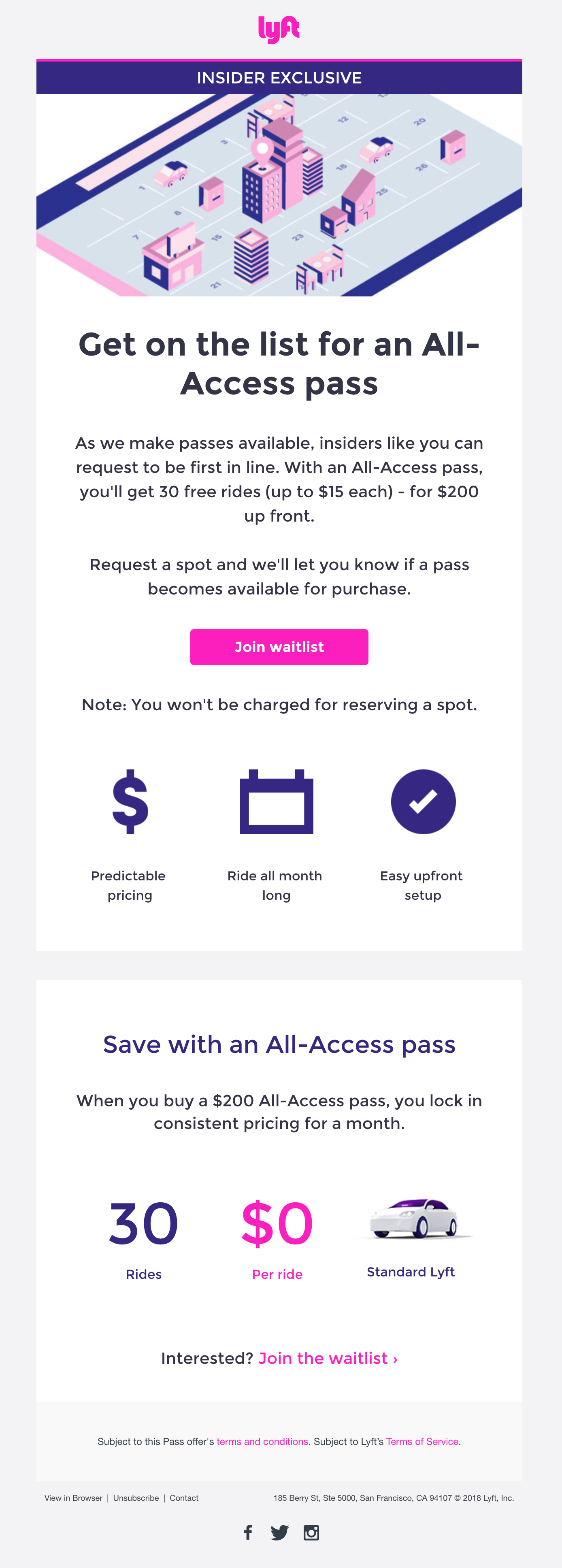 The ride-hailing service first began testing its All-Access Plan in March with a variety of plans, and now, Lyft is more widely opening up the option for frequent users to put their name on the waitlist for a pass. The All-Access Plan requires that you pay $200 up front and receive $15 off 30 rides. Any ride that is $15 or less is free, and if a ride is more than $15, your card will be charged the difference. While only top Lyft riders can add their name to the waitlist now, according to a statement provided to TechCrunch, Lyft plans to roll the All-Access Plan out to more passengers "in the coming weeks."
