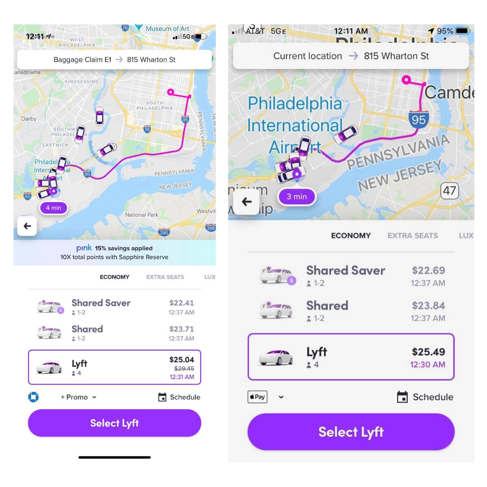 I decided to check for myself. Although I plan to upgrade to the Chase Sapphire Reserve in the coming weeks, I have the Chase Sapphire Preferred Card for the time being. My friend Patrick, on the other hand, has the Sapphire Reserve and an activated Lyft Pink membership. We put in the same grocery store location as the pickup spot and had it route us to the Charlotte Douglas International Airport (CLT). Here are the results: