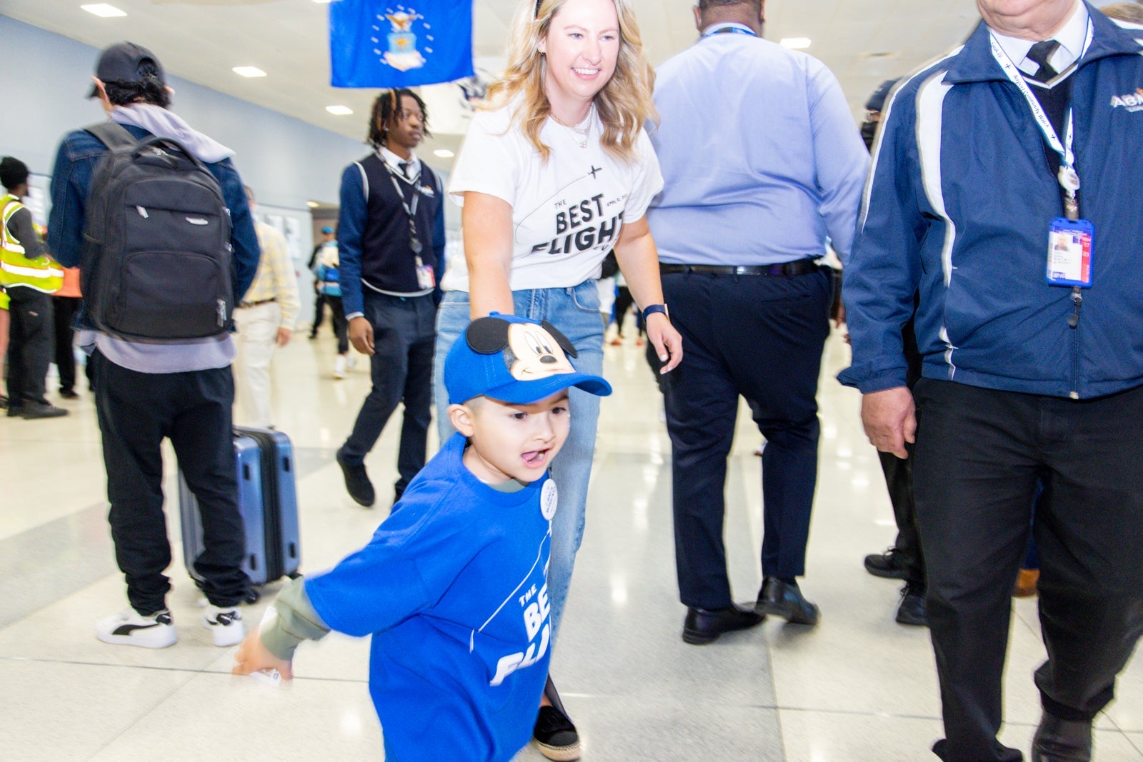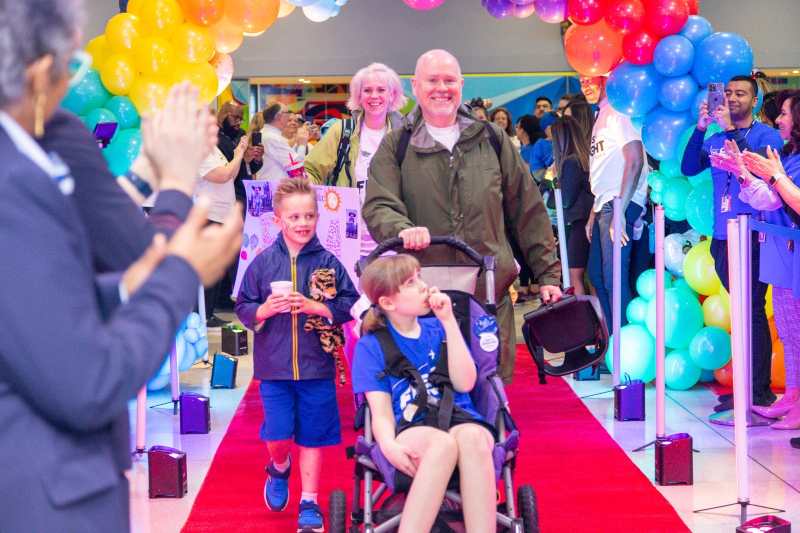 When it was time to board the flight, the master of ceremonies called each child's name and rows of people on both sides of the boarding area cheered for each family as they boarded the plane.
