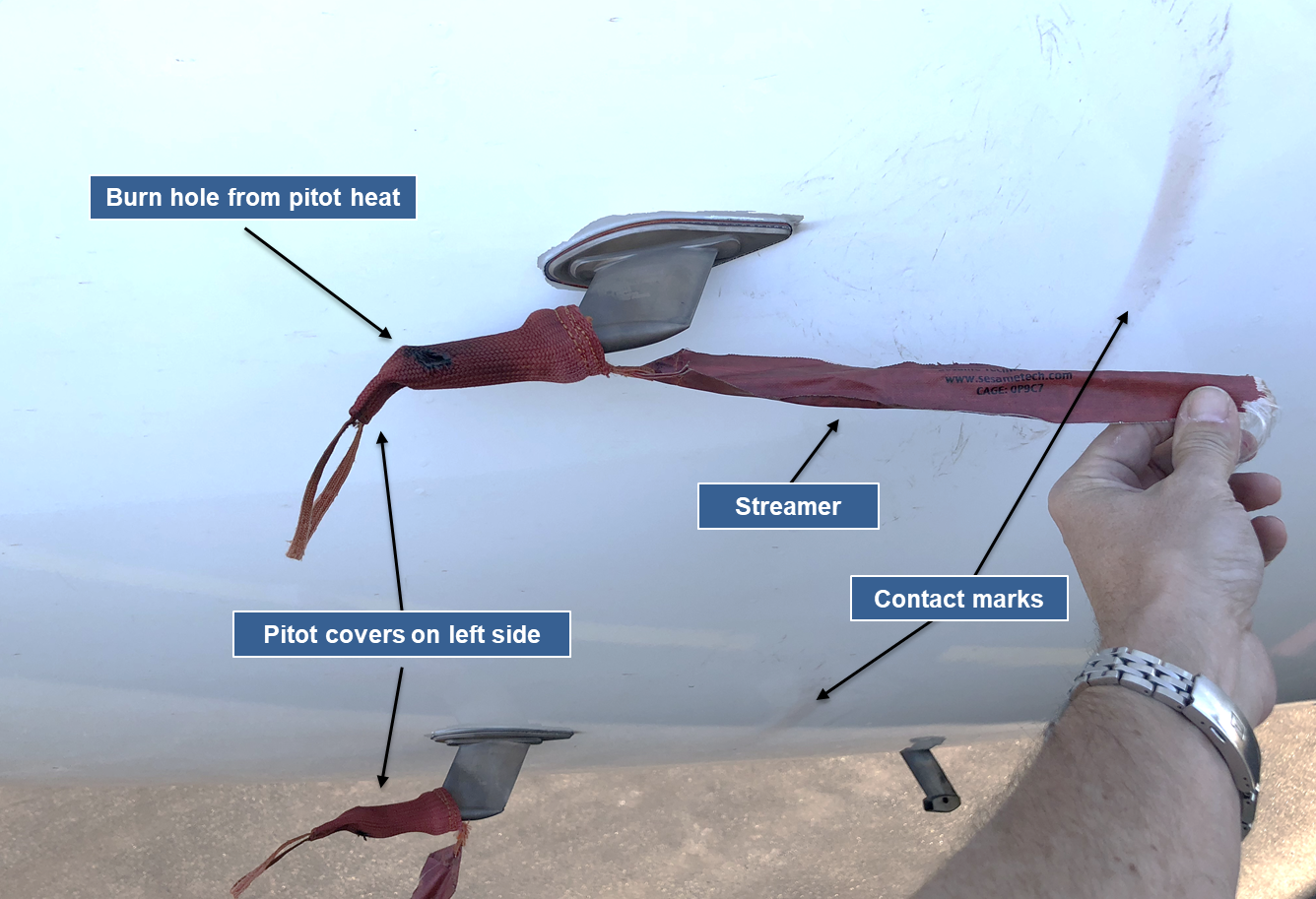The aircraft reached 10,000 feet and then turned back around for BNE, landing safely with no injuries. The investigation notes that the three covers "were partially burned by the heated pitot probes. They each had a hole burned through where the cover folded around the probe in the airstream."