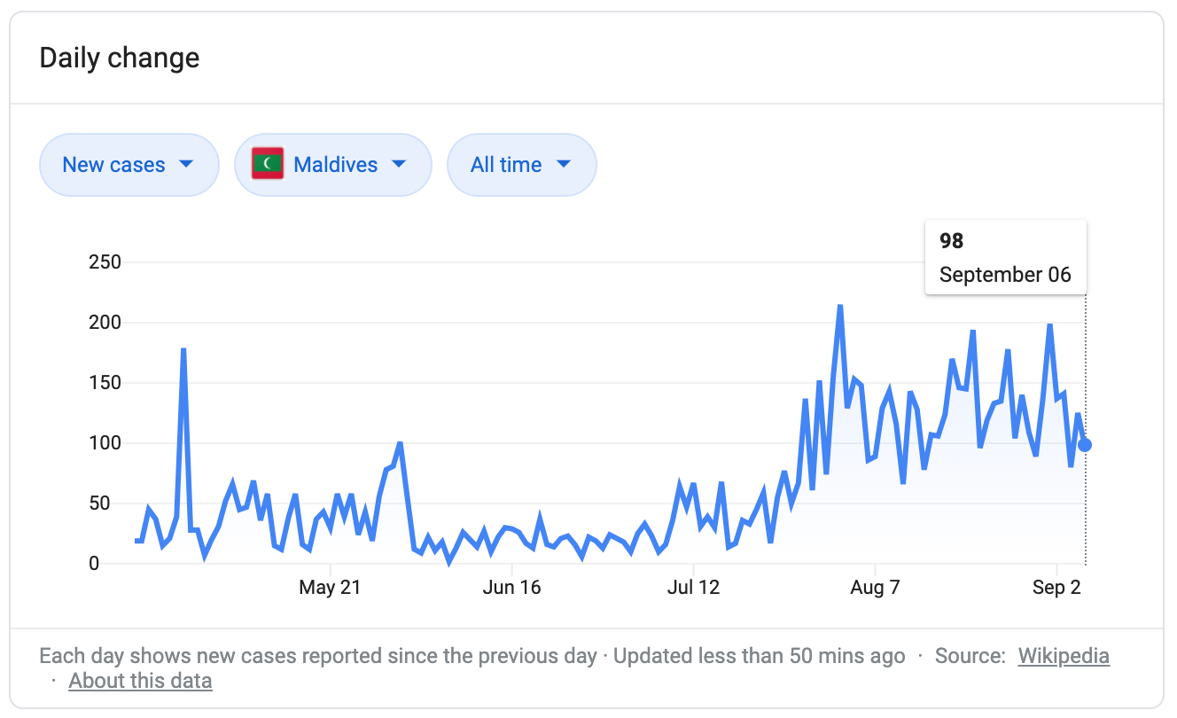 According to Google's COVID-19 tracker, The Maldives experienced a small jump in cases during the open-border period, but the country has experienced fewer than 9,000 cases overall.