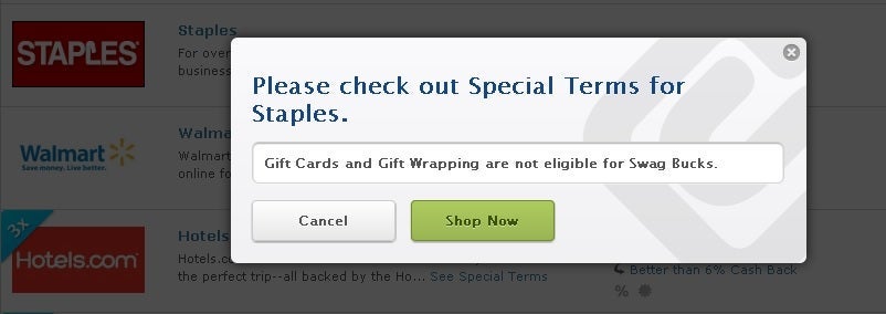 Then, in early May, multiple Flyertalk contributors who claimed to operate their own portals said that they had received notices from Staples that portals would not be offering rewards for gift card purchases. To corroborate those reports, one of the more popular reward portals, Swagbucks immediately added special terms that excluded gift cards.