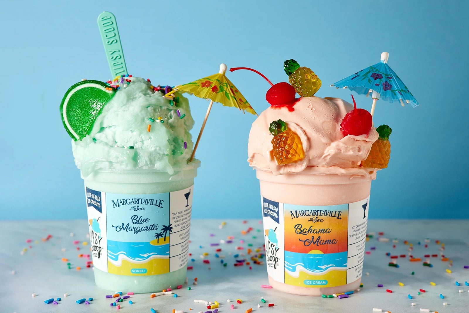 The two types of sundaes feature scoops of either the Blue Margarita sorbet or Bahama Mama ice cream along with traditional ice cream, a single serving of liquor, toppings and edible adornments.