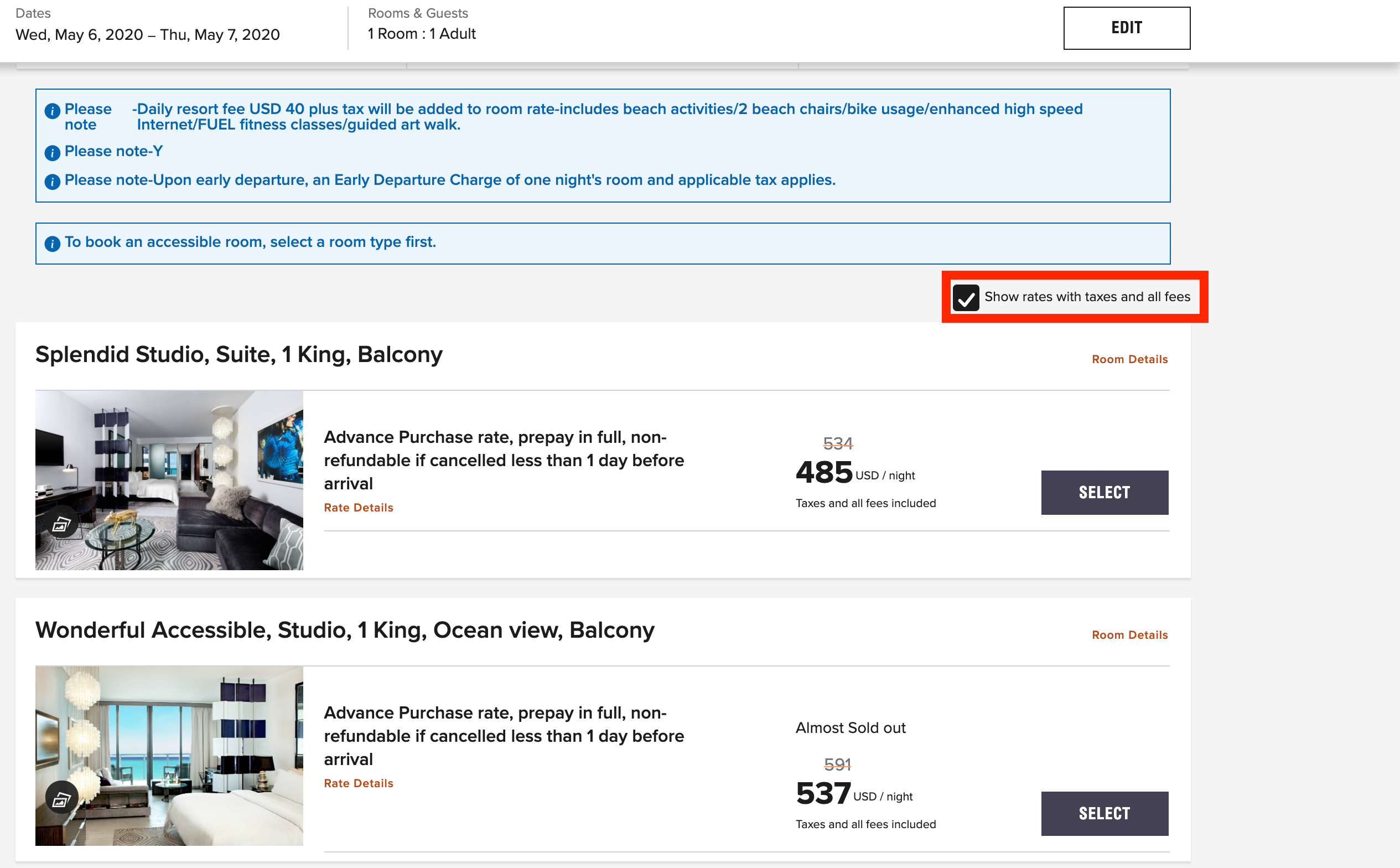 You'll see the biggest discrepancy in prices at hotels like the W South Beach that charge large resort fees, but every hotel charges some kind of tax on top of the base room rate, so it's worth using this all-in pricing feature any time you're searching for a hotel. As of now the Marriott website defaults to just showing you the base room rate, so you'll have to remember to manually check the box each time you search to see the total price.