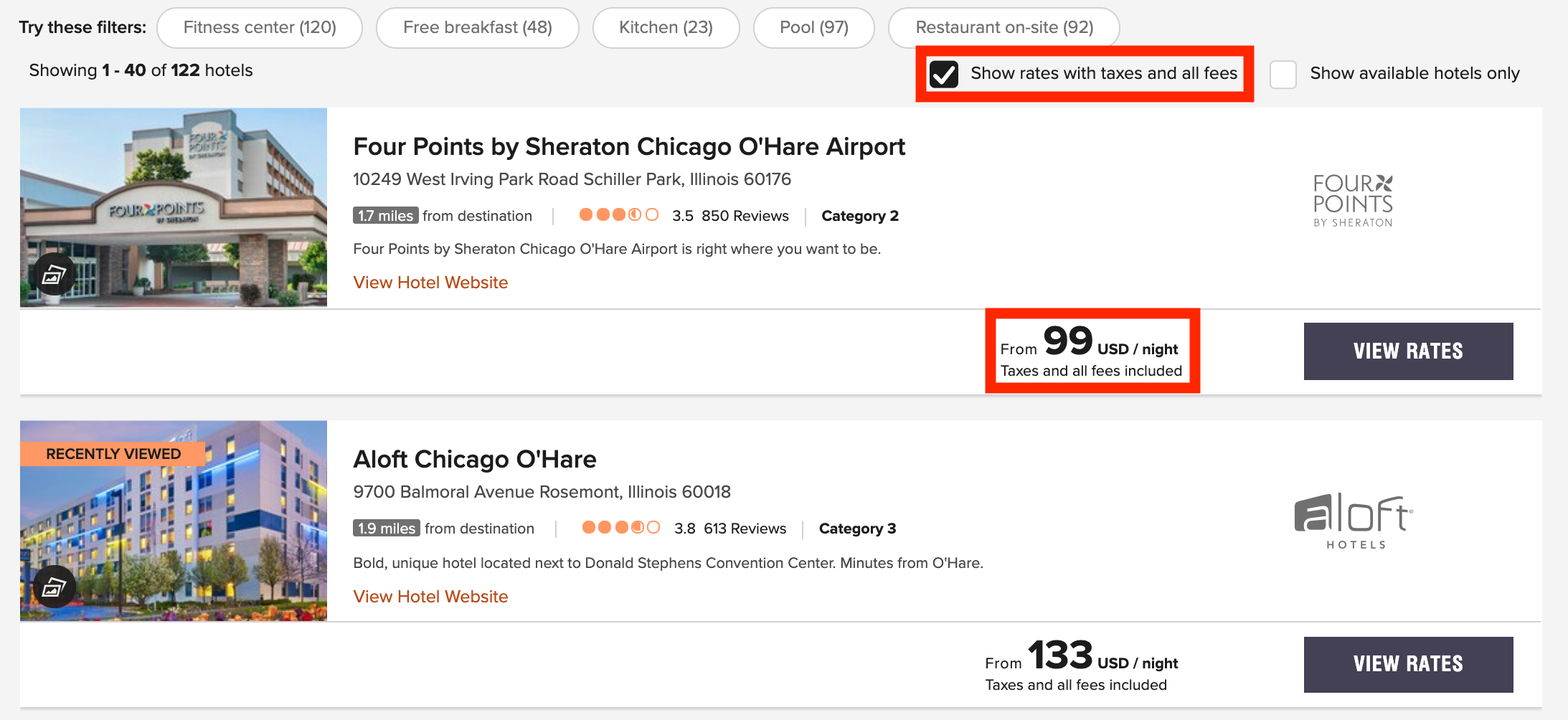 Not only is the button available once you click into a specific hotel, but you'll also see it on the general search page. Once you check it, a note will appear below the hotel price showing you that taxes and fees are included in the rate you see.