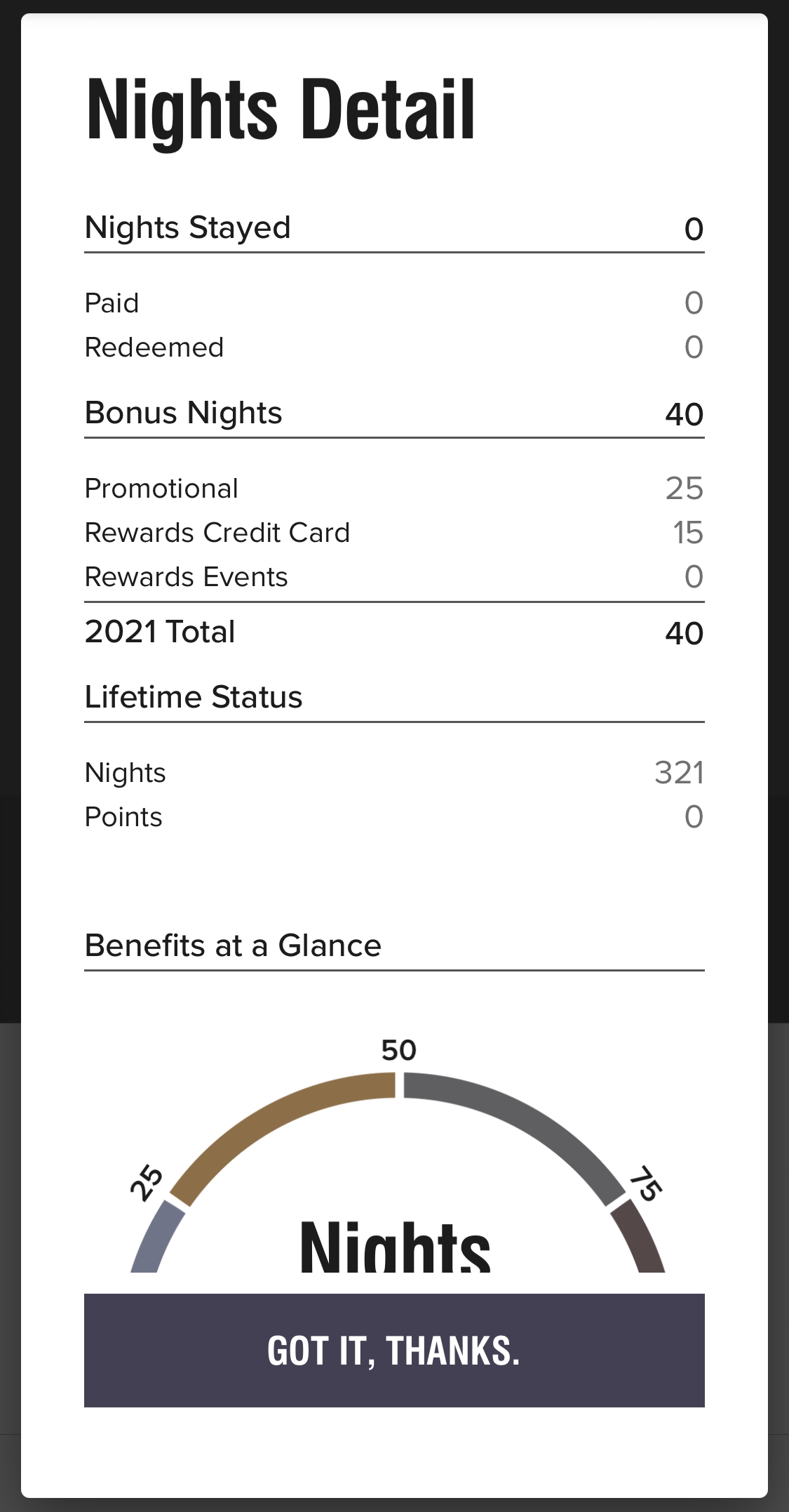 The example above is from a TPG staffer who qualified for Platinum Elite status, so they were given 25 elite nights — half of the 50-night requirement. Combined with having a Marriott credit card that automatically awards 15 elite night credits each year, that account is now just 10 nights away from requalifying for Platinum status without actually doing anything.