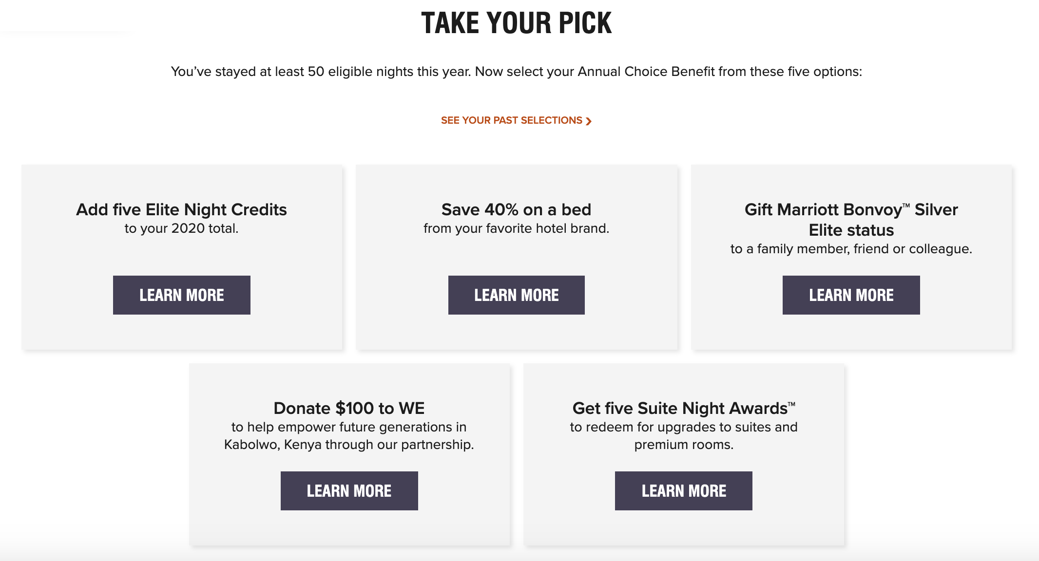 Marriott offers its top-tier elites Choice Benefits, with a selection earned after staying both 50 and then 75 nights a year. The options include things like Suite Night Awards, bonus elite night credits, gifting elite status and more. However, these perks are based solely on your actual nights in a year — and aren't automatically granted to existing lifetime elites and under the previously-announced status extensions.